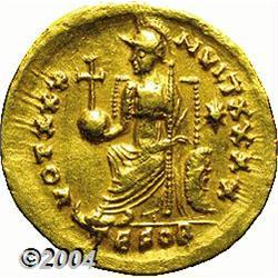<B>Theodosius II.</B></I> A.D. 408-450. AV solidus (21 mm, 4.45 g). Thessalonica, A.D. 430-440. Diademed, helmeted and cuirassed bust facing slightly right, holding spear and shield decorated with a horseman spearing fallen enemy / Constantinopolis seated left, holding globus cruciger and sceptre, foot on prow; star in right field; TESOB. RIC 366; Depeyrot 52. VF. <BR><I>From the Geneva Collection.</B></I> <BR><BR><B>Important notice:</B> Heritage usually auctions material at the rate of 200-250 lots per hour. On some occasions eBay Live bid software or the Internet may not be able to keep up with the pace of the auction. We recommend placing a realistic absentee bid now as insurance to avoid disappointment. Occasionally the auctioneer may eliminate or reject an eBay Live bid, and the auctioneer may also reopen a lot after the close of the eBay live bidding (usually because we missed an audience bid), and may reject your bid even if it shows you as the winning bidder. By bidding via eBay Live, you agree that Heritage may award the lot to another bidder at its sole discretion under the circumstances described above or any other reasonable circumstances. Since eBay bids are not shown to us until we open the lot on the floor, we treat those bids just like floor bids. In most cases the floor responds before the eBay bid is presented to us, due to Internet lag time, so for consistency we have made it a policy that floor bids are always considered first over tie eBay live bids. Also please note that all Heritage lots purchased through eBay Live carry a 20% Buyer's Premium. Please make sure you read the Terms and Conditions before you bid.