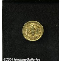 <B>Theodosius II.</B></I> A.D. 408-450. AV solidus (21 mm, 4.45 g). Thessalonica, A.D. 430-440. Diademed, helmeted and cuirassed bust facing slightly right, holding spear and shield decorated with a horseman spearing fallen enemy / Constantinopolis seated left, holding globus cruciger and sceptre, foot on prow; star in right field; TESOB. RIC 366; Depeyrot 52. VF. <BR><I>From the Geneva Collection.</B></I> <BR><BR><B>Important notice:</B> Heritage usually auctions material at the rate of 200-250 lots per hour. On some occasions eBay Live bid software or the Internet may not be able to keep up with the pace of the auction. We recommend placing a realistic absentee bid now as insurance to avoid disappointment. Occasionally the auctioneer may eliminate or reject an eBay Live bid, and the auctioneer may also reopen a lot after the close of the eBay live bidding (usually because we missed an audience bid), and may reject your bid even if it shows you as the winning bidder. By bidding via eBay Live, you agree that Heritage may award the lot to another bidder at its sole discretion under the circumstances described above or any other reasonable circumstances. Since eBay bids are not shown to us until we open the lot on the floor, we treat those bids just like floor bids. In most cases the floor responds before the eBay bid is presented to us, due to Internet lag time, so for consistency we have made it a policy that floor bids are always considered first over tie eBay live bids. Also please note that all Heritage lots purchased through eBay Live carry a 20% Buyer's Premium. Please make sure you read the Terms and Conditions before you bid.