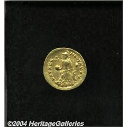 <B>Theodosius II.</B></I> A.D. 408-450. AV solidus (21 mm, 4.45 g). Thessalonica, A.D. 430-440. Diademed, helmeted and cuirassed bust facing slightly right, holding spear and shield decorated with a horseman spearing fallen enemy / Constantinopolis seated left, holding globus cruciger and sceptre, foot on prow; star in right field; TESOB. RIC 366; Depeyrot 52. VF. <BR><I>From the Geneva Collection.</B></I> <BR><BR><B>Important notice:</B> Heritage usually auctions material at the rate of 200-250 lots per hour. On some occasions eBay Live bid software or the Internet may not be able to keep up with the pace of the auction. We recommend placing a realistic absentee bid now as insurance to avoid disappointment. Occasionally the auctioneer may eliminate or reject an eBay Live bid, and the auctioneer may also reopen a lot after the close of the eBay live bidding (usually because we missed an audience bid), and may reject your bid even if it shows you as the winning bidder. By bidding via eBay Live, you agree that Heritage may award the lot to another bidder at its sole discretion under the circumstances described above or any other reasonable circumstances. Since eBay bids are not shown to us until we open the lot on the floor, we treat those bids just like floor bids. In most cases the floor responds before the eBay bid is presented to us, due to Internet lag time, so for consistency we have made it a policy that floor bids are always considered first over tie eBay live bids. Also please note that all Heritage lots purchased through eBay Live carry a 20% Buyer's Premium. Please make sure you read the Terms and Conditions before you bid.