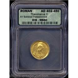 <TABLE cellSpacing=0 cellPadding=0 width="100%" bgColor=#000000 border=0><TBODY> <TR><TD width="100%"><TABLE cellSpacing=1 cellPadding=3 width="100%" border=0><TBODY><TR><TD width="100%" bgColor=#79735c><FONT face=arial color=#ffffff size=3><B>Description</B> </FONT></TD></TR><TR><TD width="100%" bgColor=#ffffff><FONT face=arial size=2><B>Theodosius II.</B></I> A.D. 402-450. AV solidus (20 mm). Thessalonica, A.D. 424-425/30. Diademed, helmeted and cuirassed three-quarter bust facing slightly right, holding spear over right shoulder and on left arm shield decorated with a horseman spearing fallen enemy / Theodosius standing facing, holding labarum in right hand, globus cruciger in left; star in left field; TESOB. RIC 361; D. M. Metcalf, "Minting at Thessalonica in the Fifth and Sixth Centuries," <I>Studies in Early Byzantine Gold Coinage</B></I> 70-95; Depeyrot 51/1. MS60 ICG. </FONT></TD></TR></TBODY></TABLE></TD></TR></TBODY></TABLE><BR><A name=PricesRealized></A><TABLE cellSpacing=0 cellPadding=0 width="100%" bgColor=#000000 border=0><TBODY><TR><TD width="100%"><TABLE cellSpacing=1 cellPadding=3 width="100%" border=0><TBODY><TR><TD width="100%" bgColor=#79735c><A name=PR><FONT face=arial color=#ffffff size=3><B>Previous Prices from Heritage Auctions</B> </FONT></A></TD></TR><TR><TD bgColor=#f6f6ed>No Prior Data Recorded </TD></TR><TR><TD bgColor=#ffffff><FONT face=arial size=1 ?>PLEASE NOTE: All prices realized reflect the final hammer price PLUS the buyer's premium in auctions that charge a buyer's premium. Each item has a notation at the top of the listing indicating whether that lot included a buyer's premium. Example: A item that sells with a final hammer price of $100 and a 20% buyer's premium will display with a price realized of $120. All information listed is intended to be as accurate as possible, but errors are possible. Please use this guide carefully and inform us of any inaccuracies. </FONT></TD></TR></TBODY></TABLE></TD></TR></TBODY></TABLE><BR><TABLE cellSpacing=0 cellPadding=0 width="100%" bgColor=#000000 border=0><TBODY><TR><TD width="100%"><TABLE cellSpacing=1 cellPadding=3 width="100%" border=0><TBODY><TR><TD width="100%" bgColor=#79735c colSpan=6><FONT face=arial color=#ffffff size=3><B>Price Guide*</B> </FONT></TD></TR><TR bgColor=#f6f6ed><TD align=middle><B>Grade</B> </TD><TD align=middle><B>Coin World<BR>(Trends)</B> </TD><TD align=middle><B>Numismedia<BR>Retail</B> </TD><TD align=middle><B>Numismedia<BR>Wholesale</B> </TD><TD align=middle><B>Coin<BR>Universe</B> </TD><TD align=middle><B>Heritage<BR>Value Index</B> </TD></TR><TR bgColor=#ffffff><TD colSpan=6><FONT size=1>*All information listed is intended to be as accurate as possible, but errors are possible. No item may be returned or refused based on this information which is provided as a service to our customers. You should contact each pricing source directly to determine the accuracy of this information. </FONT></TD></TR></TBODY></TABLE></TD></TR></TBODY></TABLE><BR><TABLE cellSpacing=0 cellPadding=0 width="100%" bgColor=#000000 border=0><TBODY><TR><TD width="100%"><TABLE cellSpacing=1 cellPadding=3 width="100%" border=0><TBODY><TR><TD width="100%" bgColor=#79735c><FONT face=arial color=#ffffff size=3><B>Population Guide</B> </FONT></TD></TR><TR bgColor=#ffffff> Important notice: Heritage usually auctions material at the rate of 200-250 lots per hour. On some occasions eBay Live bid software or the Internet may not be able to keep up with the pace of the auction. We recommend placing a realistic absentee bid now as insurance to avoid disappointment. Occasionally the auctioneer may eliminate or reject an eBay Live bid, and the auctioneer may also reopen a lot after the close of the eBay live bidding (usually because we missed an audience bid), and may reject your bid even if it shows you as the winning bidder. By bidding via eBay Live, you agree that Heritage may award the lot to another bidder at its sole discretion under the circumstances described above or any other reasonable circumstances. Also please note that all Heritage lots purchased through eBay Live carry a 20% Buyer's Premium. Please make sure you read the Terms and Conditions before you bid.</TD></TR></TBODY></TABLE></TD></TR></TBODY></TABLE>