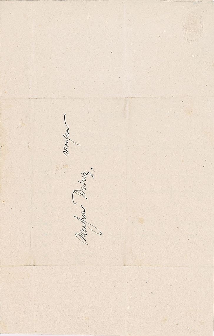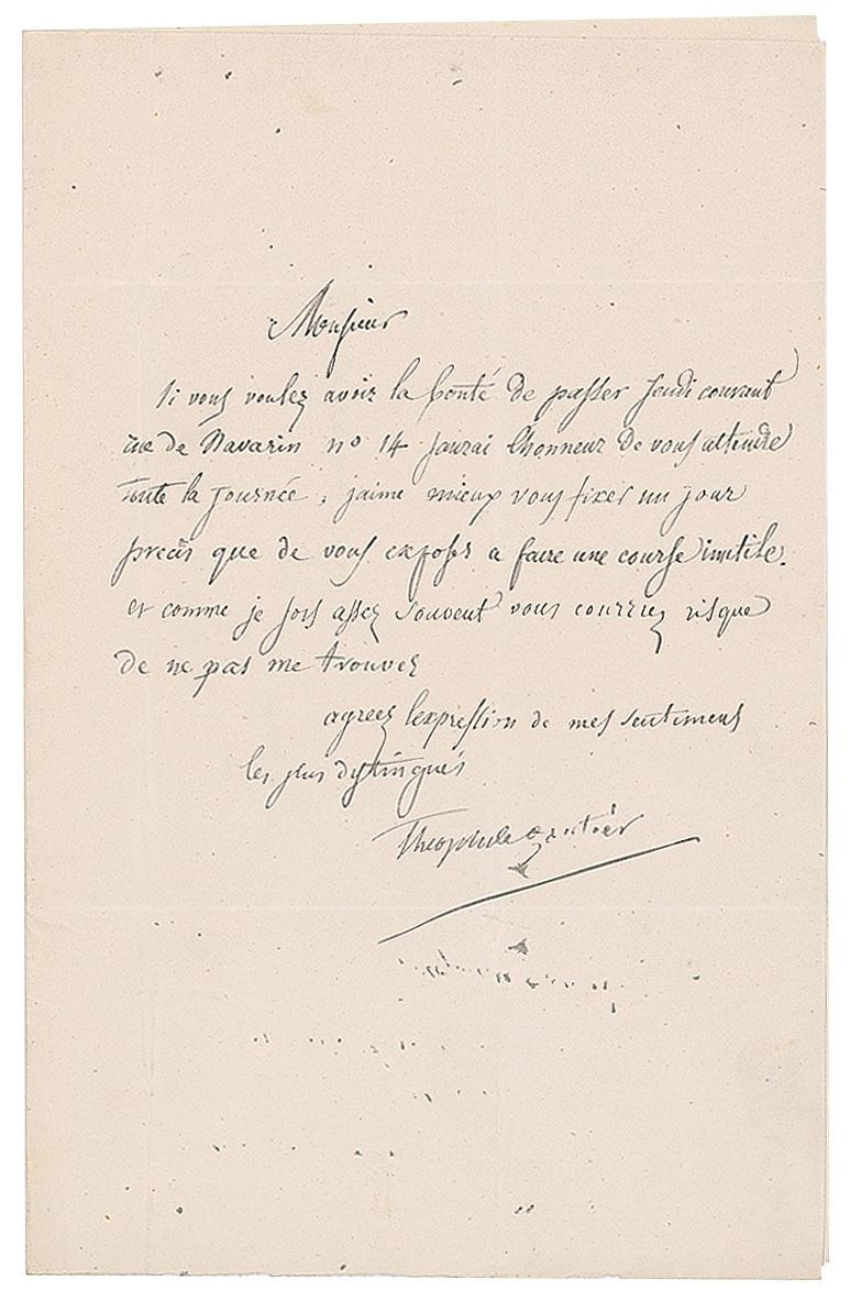 Rare ALS in French, one page, 5.25 x 8.25, no date [September 25, 1846]. Letter to "Desrez," in part (loosely translated): "If you want to have the goodness to spend Thursday running at Navarin nr. 14, I will have the honor of waiting for you all day; I'd rather fix yourself on a specific day than expose you to a useless race and as I go out quite often you run the risk of not finding me." In fine condition, with several intersecting folds.