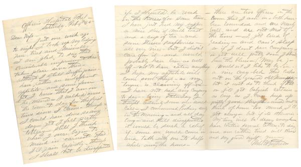 [CIVIL WAR SURGEON LETTER] WILLIAM HARRISON GITHENS (1827-1904) Surgeon in the Union army during the American Civil War. At the outset of the war, Githens enlisted as an Orderly Sergeant in the 16th Illinois Infantry. During this enlistment, he was stationed in Missouri, Tennessee and Pennsylvania and saw very little action. Following his re-enlistment in 1863, Githens was promoted to Assistant Surgeon and served with the 78th Regiment, Illinois Volunteers. As a member of the 14th Army Corp . during this second enlistment, he was very active, serving as an assistant surgeon in the Tullahoma operation, Chickamauga, Chattanooga, the Atlanta Campaign, the March to the Sea and the Carolinas’ Campaign. Following the war, Githens returned home to Hamilton, Illinois, where he owned a number of pharmacies. ALS. Three pages, 4 7/8” x 8”. Officer’s Hospital Phil. Saturday February 4, 1864. William Githens writes to his wife, in part: “Just one week ago tonight I took up my lodging here, tired and miserable. I am glad to say that considerable improvement has taken place since then - although I still suffer pain - have rather an indifferent appetite and some fever, yet I know that I am on the mend - I walked across the room today for the first time since I came - though I could have done so any day - yet I fell pretty tottery - still I think when I once begin to mend in earnest that I’ll gain rapidly … There are two officers in the room that I am in - both have been wounded and are nearly well and are out most of the time - I get tired of reading - and can’t sleep so if I don’t have company or get well pretty soon I shall have the blue … Wouldn’t I like to be in a nice cozy bed that looks out onto the grand Mississippi - but it won’t do to think of that or I’ll get babyish certain … will close to say good night … ” Usual folds. Slight edge splits to folds. Overall Fine.
