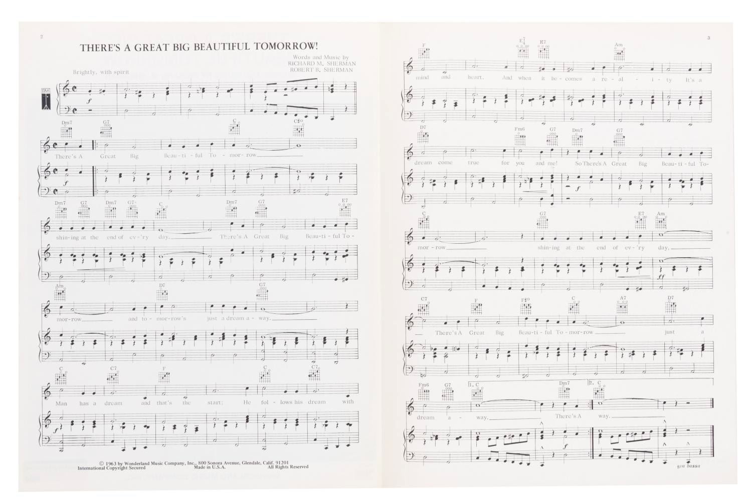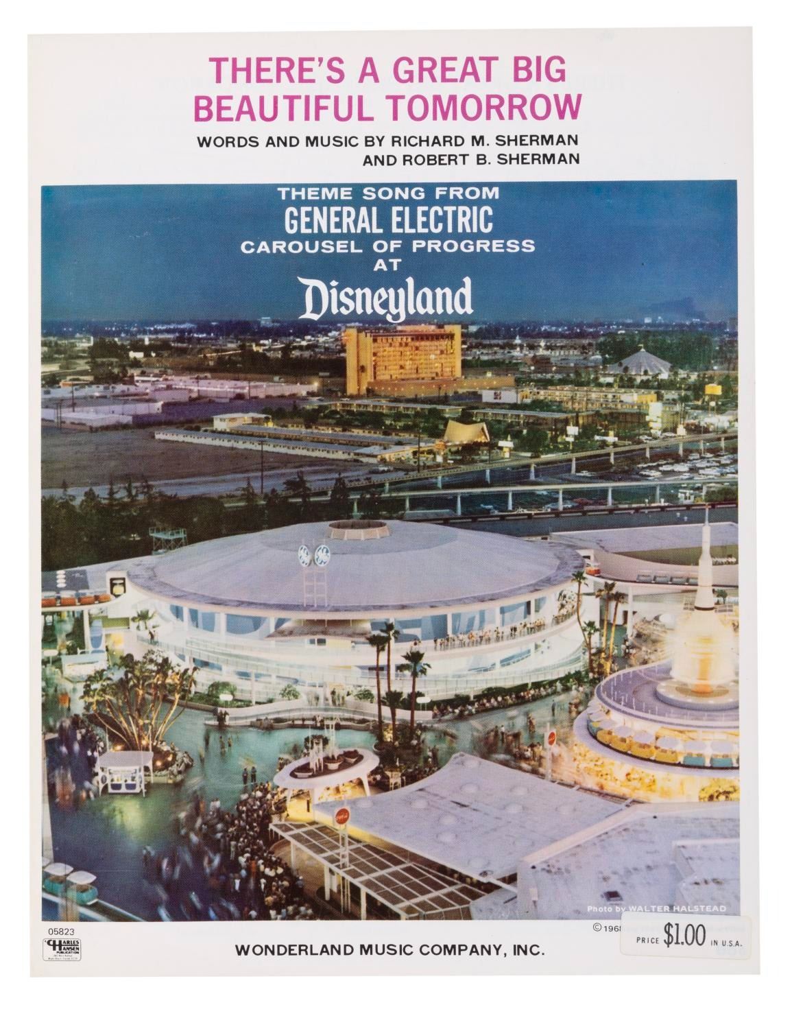 (Wonderland Music Co. Inc., 1968) Sheet music for the Carousel of Progress theme "There’s A Great Big Beautiful Tomorrow" composed and written by the Sherman Brothers. Measuring 8.5" x 11", the sheet music is in very good condition with light creasing and discoloration.