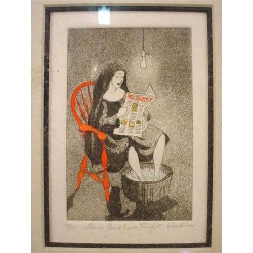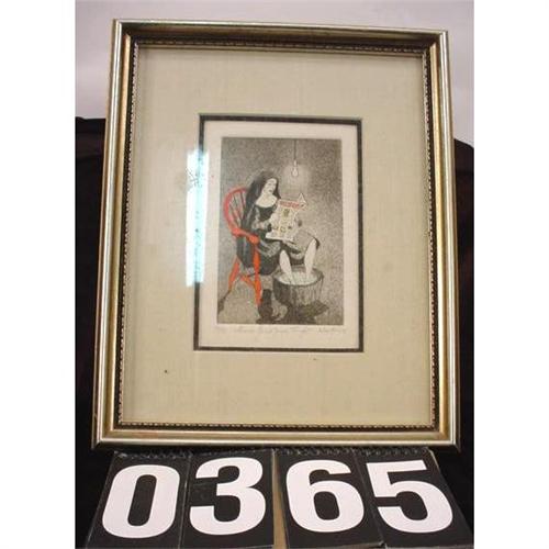 Limited edition print ( Theris good news tonight )21/50 by Keric, this framed print showing a nun reading the newspaper while soaking her feet, it is in a museum quality frame 9-1/2" x 12" and nice condition.[]54]