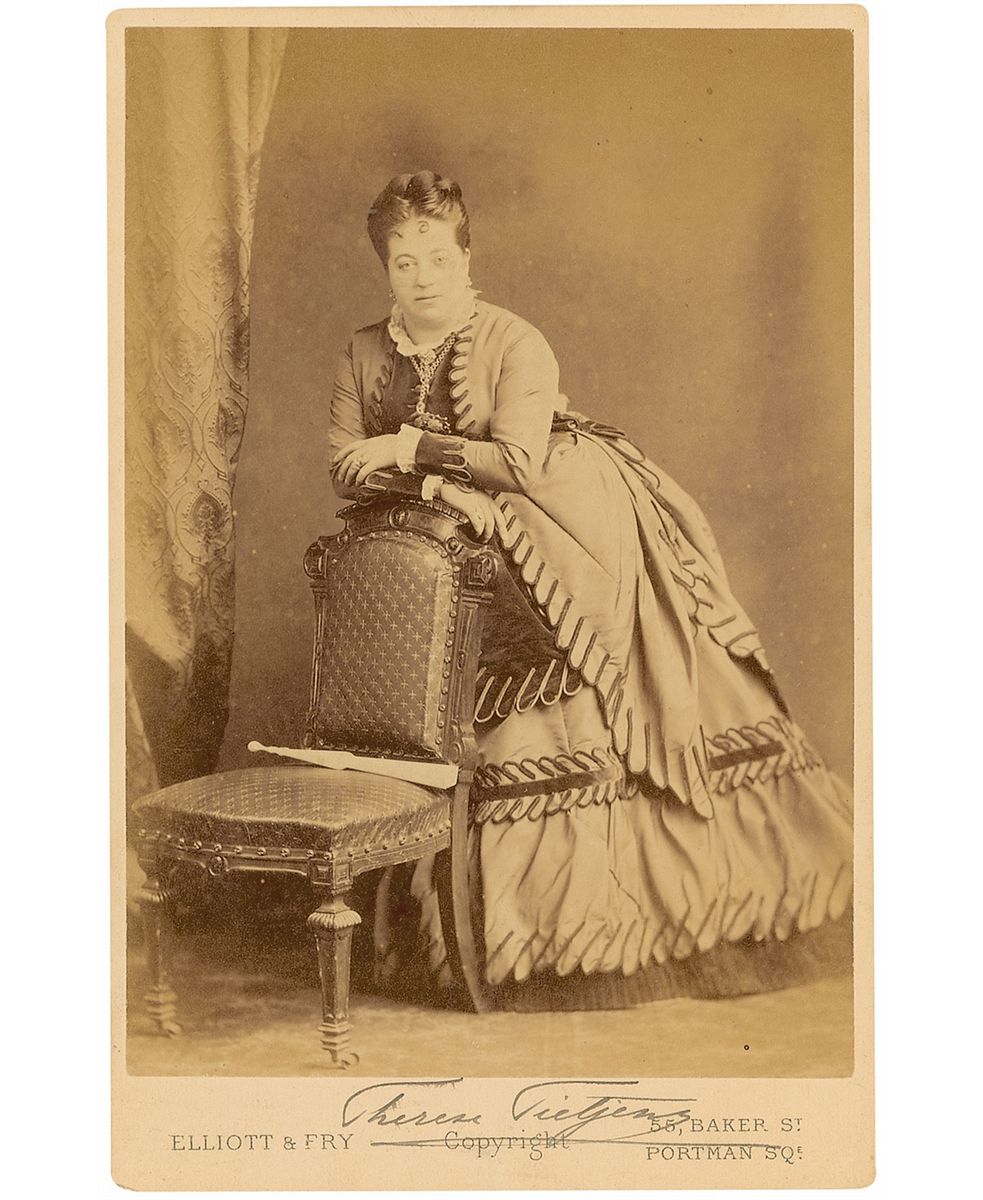 Dramatic soprano (1831–1877) whose triumphant career was cut short by cancer. Original 4.25 x 6.5 full-length cabinet photo by Elliott and Fry of Tietjens leaning over a parlor chair, signed in the lower border in black ink. In fine condition, with a bit of trivial silvering to image and pencil marks and mounting remnants on reverse.