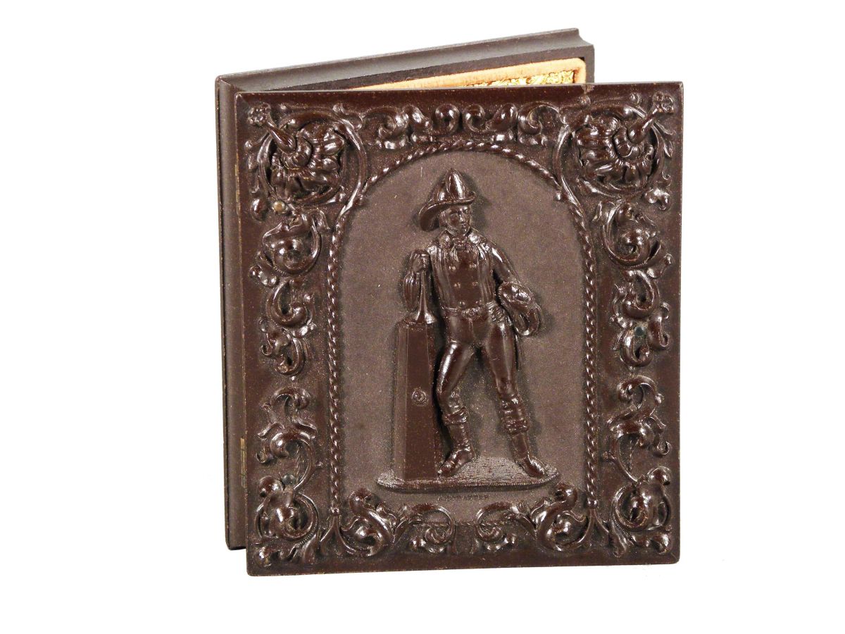 Thermo Plastic Case with embossed standing fireman, 1857. Complete with mat preserver and glass (no image). Excellent condition. 1/6 plate size, 3 1/2 x 3 3/4 inches closed.