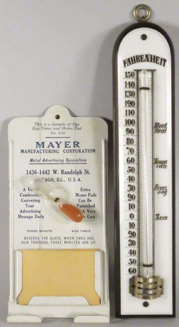 Thermometer and Egg Timer/Memo Pad. Milk glass and wood thermometer, mint working condition. Mayer Mfg Co. Sample Tin Egg Timer/Memo pad, 4 X 8 3/4 inches.