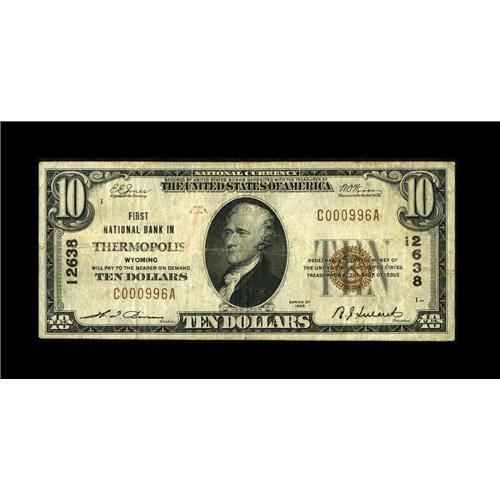 <B>Thermopolis, WY</B></I> - $10 1929 Ty. 1 <B>First NB</B></I> Ch. # 12638<BR>A nice <B>Fine</B></I> from the only issuer of small size in this Hot Springs County locale.<BR><BR><b>Shipping:</b> Coin/Currency (<a target="_blank" href="http://www.heritageauctions.com/common/shipping.php">view shipping information</a>)