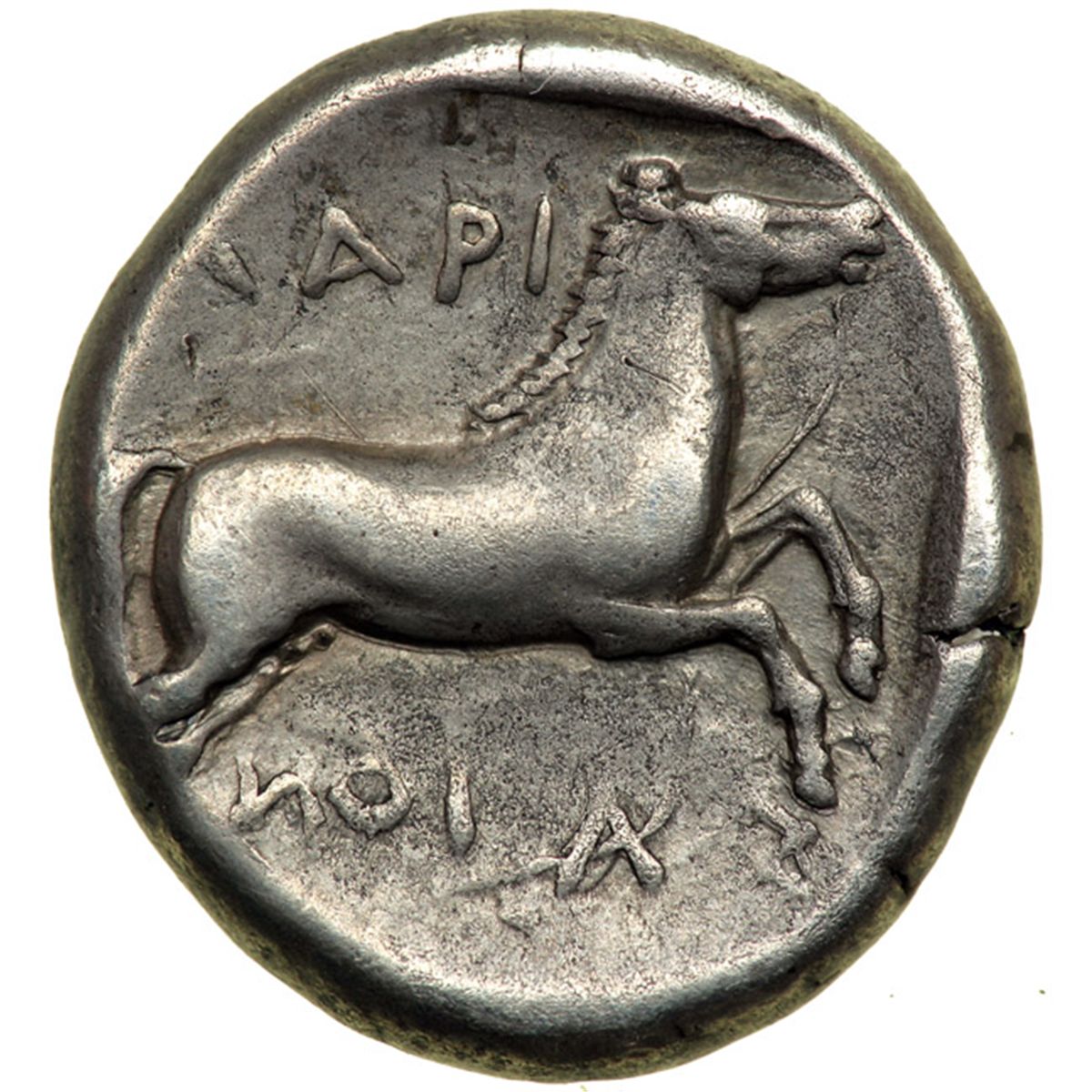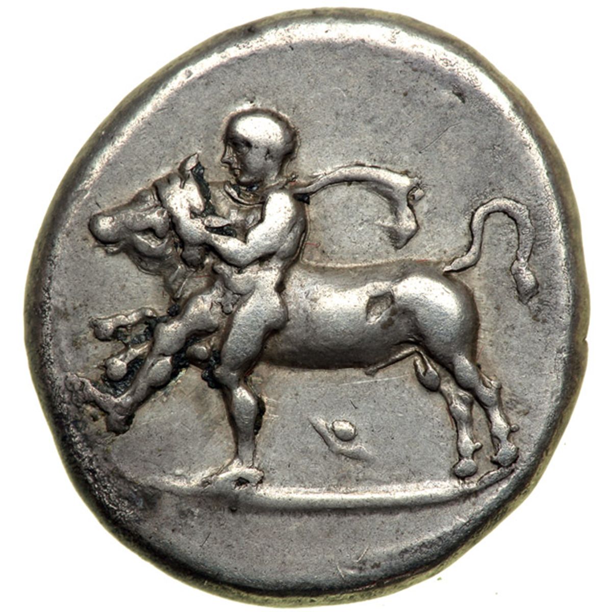Thessaly, Larissa, c. 435-400 BC. AR Drachm (6.03 g). Youth restraining bull left. Reverse: Horse prancing right with loose rein. Herrmann III E, pl. II, 7; Babelon (Traité) 660, pl. CCXCVI, 17 (same dies); Lorber pl. 43, 55; Dewing 1387. Well centered. Choice Very Fine.