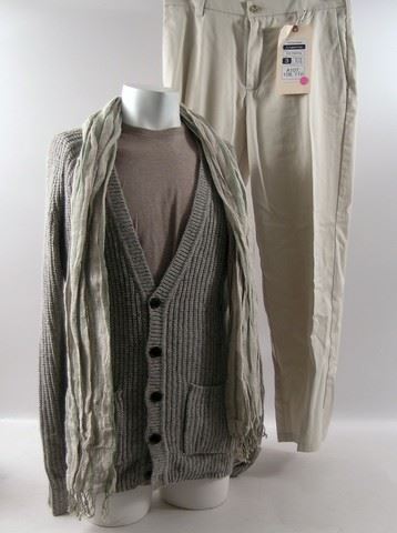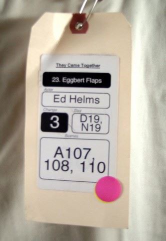 Eggbert (Ed Helms) screen worn, hero, oatmeal with brown elbow patches 'Shades of Grey' sweater, (size M) oatmeal and green stripe scarf with fringe, light brown short sleeve 'Merona' t-shirt, (size M) and khaki twill flat front 'Merona' pants. (size 34) Includes wardrobe tag!