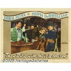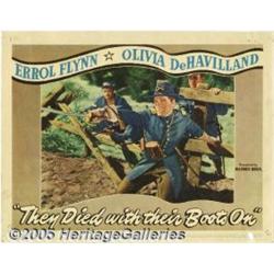 <B>They Died With Their Boots On (Warner Brothers, 1945)</B></I> Lobby Cards (2) (11" X 14"). Errol Flynn was the consummate swashbuckler who added a splash of dash and bravado to all his scene roles. This Warner epic has Flynn cast as the larger-than-life cavalier George Armstrong Custer who rises to the rank of Brigadier General during the civil war. Offered in this lot are two scene cards from this title, both featuring Flynn. There are several corner and border pinholes, stains, one border hole, a light censor stamp and some scattered pinholes in the graphics. Very Good/Fine. 2 items