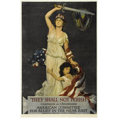 <B>They Shall Not Perish.</B></I> 30" x 40", Artist: Douglas Voik. Produced for the American Committee for Relief in the Near East, including Armenia, Greece, Syria, and Persia. This poster has a powerful and ominous feeling about it, invoking the feelings one gets with a Raleigh image. The dark and deliberately jagged strokes make Columbia even more fierce and protective looking. She stands over a child, protecting her. The message is clear and the image is clearer; this is what makes these posters so arresting even today. <BR><BR>Condition: Extra Fine - small tear on lower edge; linen backed.