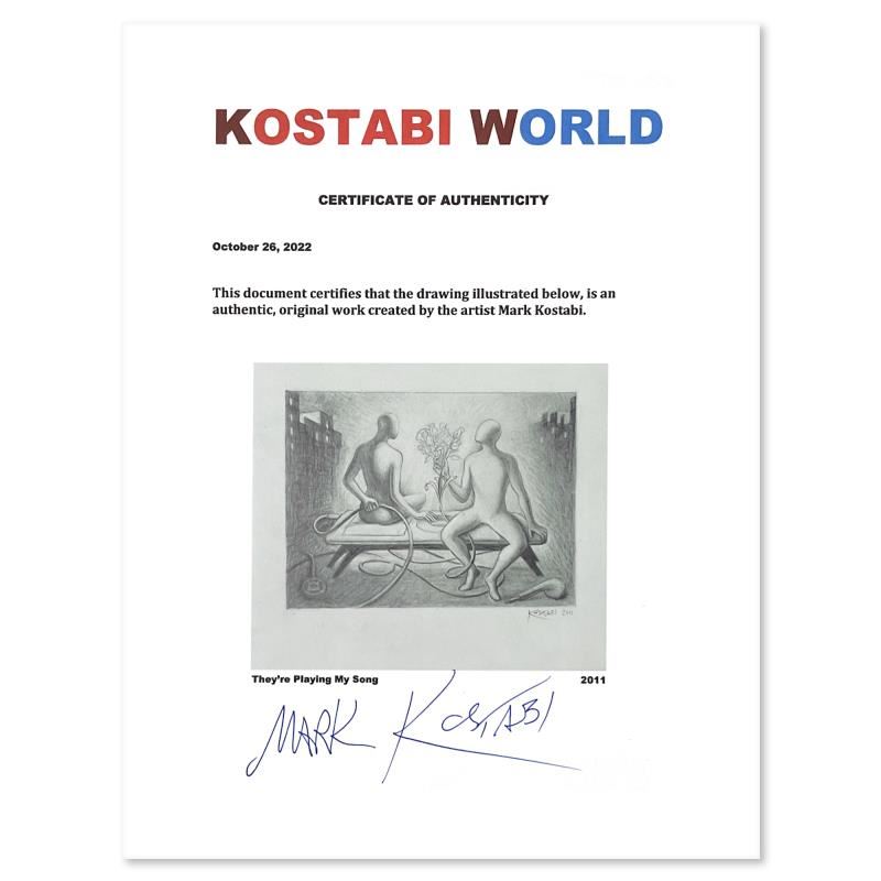 "They're Playing My Song" is an original drawing on paper by Mark Kostabi, dated 2011 and hand signed by the artist. This piece comes custom framed. Includes Certificate of Authenticity. Measures approx. 17.5" x 15" (frame), 9" x 7" (image).