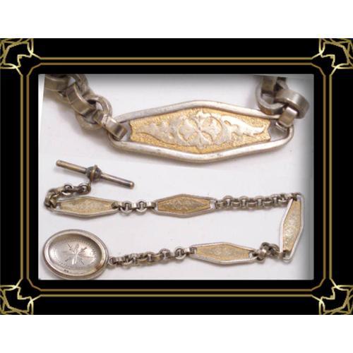 I think this is a pre-1900?s mixed metal thick watch chain with large hollow two sided fob. The links are silver and gold in color ( not sure on the content) and double sided so you see the design on both sides. This measures 12" long ( includes the 1 1/3" long fob). Has not been polished or cleaned.