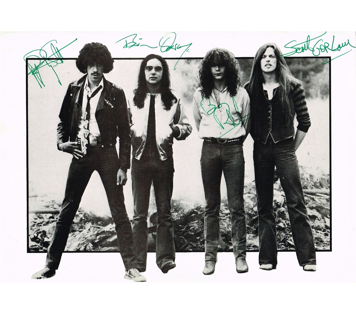 A scarce Bad Reputation Tour Programme signed on the band photograph by Phil Lynott, Scott Gorham, Brian Downey and Brian Robertson. Also with Thin Lizzy World Tour 1980 programme and 1979 tour programme (3 items)