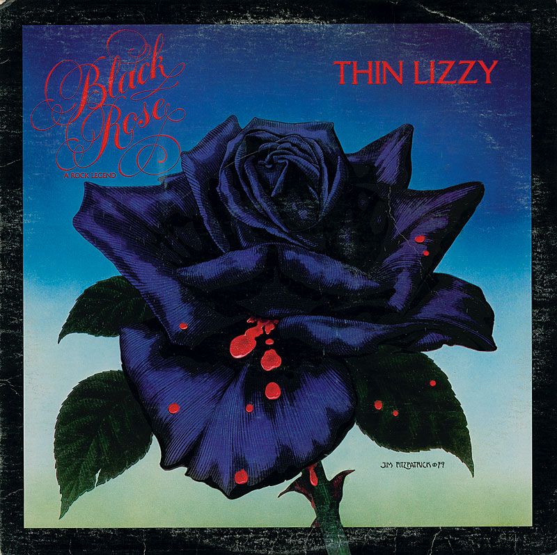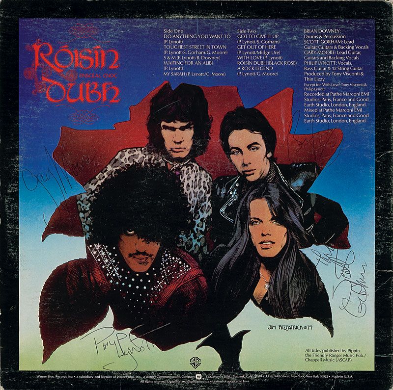 Black Rose: A Rock Legend album signed on the back cover in black ballpoint by Phil Lynott, Brian Downey, Scott Gorham, and Gary Moore (deceased lead guitarist). In very good condition, with light to moderate contrast to Moore’s and Downey’s signatures, s