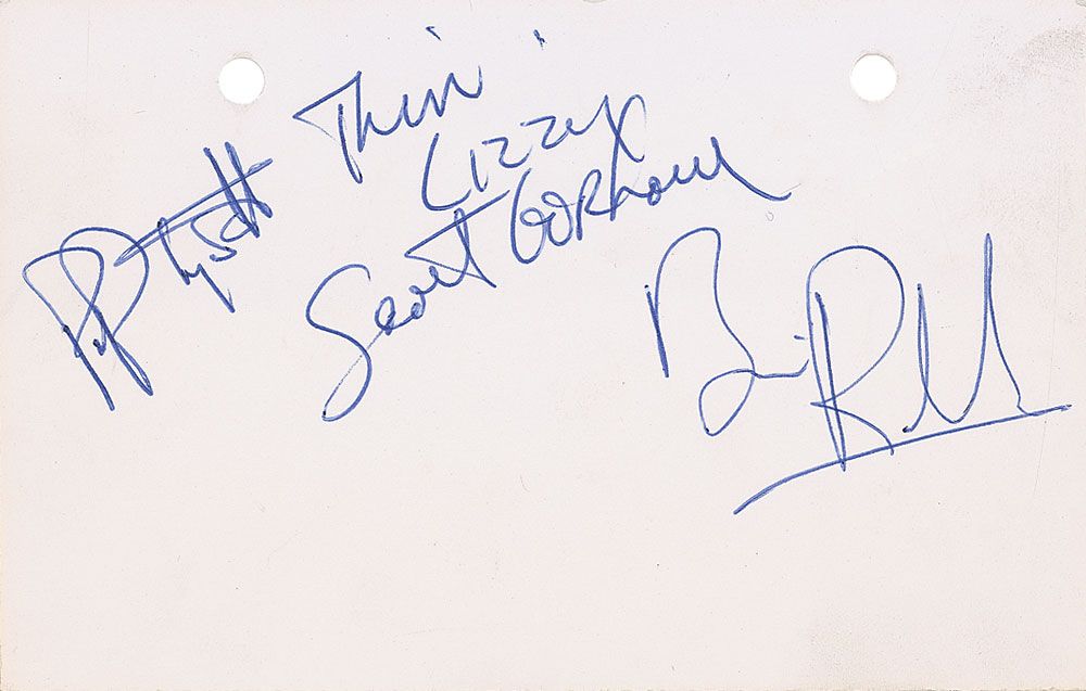 Vintage ballpoint signatures of Phil Lynott, Brian Robertson, and Scott Gorham, adding “Thin Lizzy” above his signature. In fine condition.