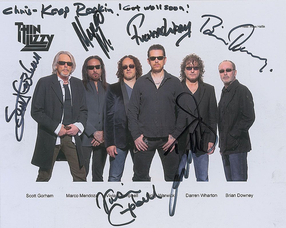 Color 10 x 8 cardstock group photo, signed in black felt tip by Scott Gorham, Marco Mendoza, Vivian Campbell, Ricky Warwick, Darren Wharton, and Brian Downey, with one member inscribing along the top, “Chris—Keep Rockin! Get well soon!” In fine condition.