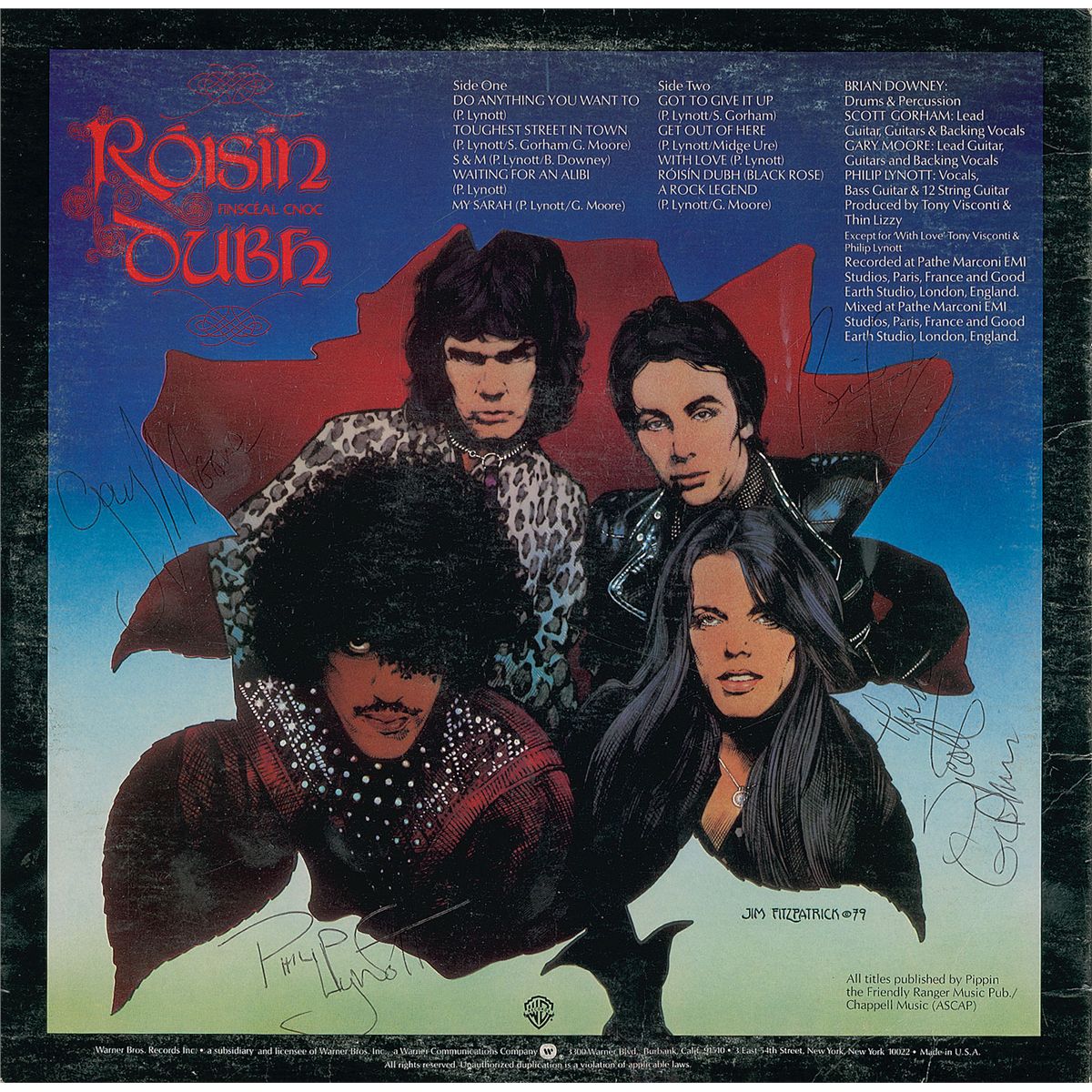 Black Rose: A Rock Legend album signed on the back cover in black ballpoint by Phil Lynott, Brian Downey, Scott Gorham, and Gary Moore. In very good condition, with light to moderate contrast to Moore’s and Downey’s signatures, scattered edge creases, light rubbing to covers, and a mild ‘ring of wear’ to both covers. Album has been sealed in plastic wrap, which is easily removable. The record is not included. Released in 1979, Black Rose has been described as one of the band's best and most successful albums. Accompanied by a full letter of authenticity from Roger Epperson/REAL.