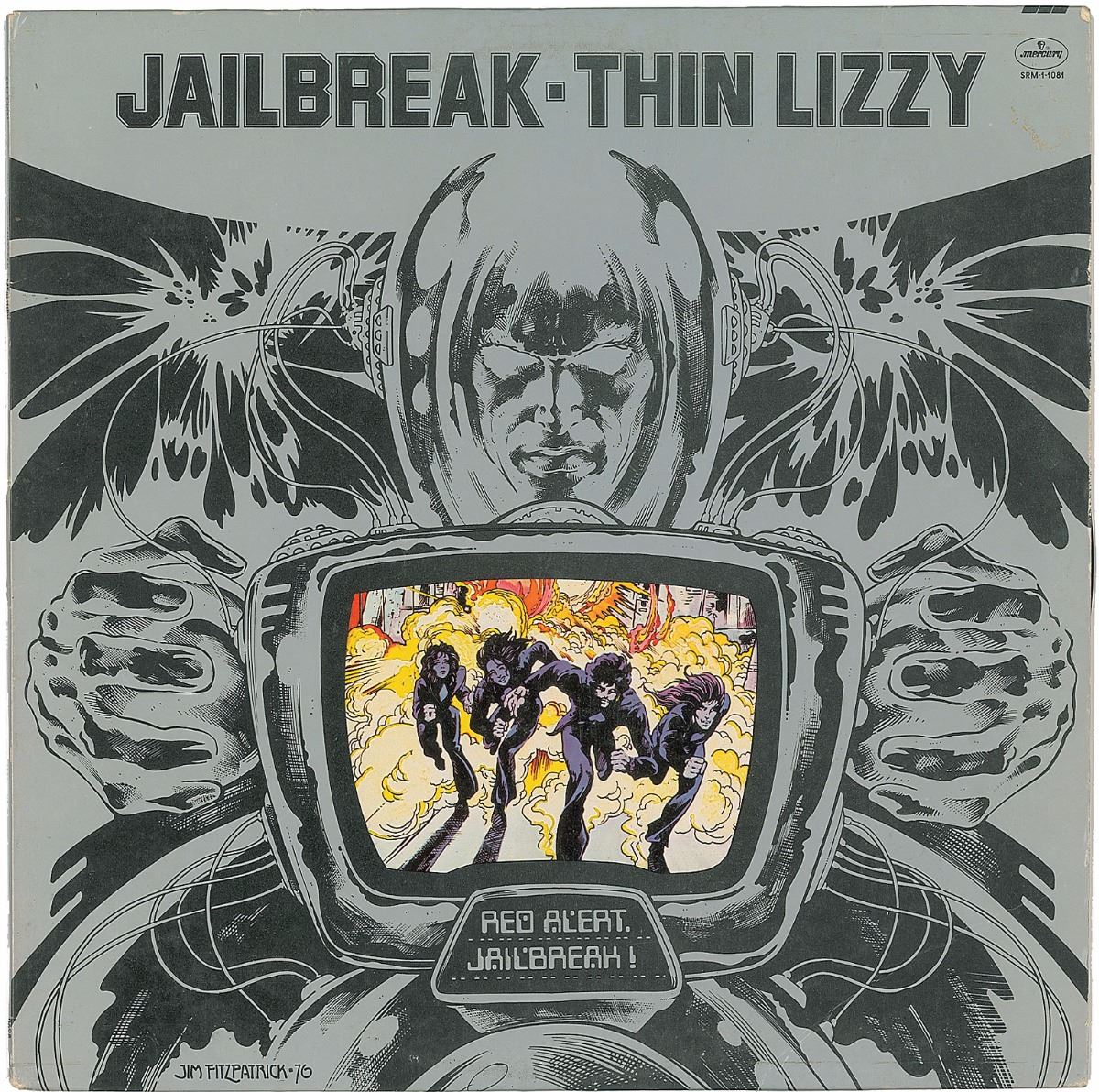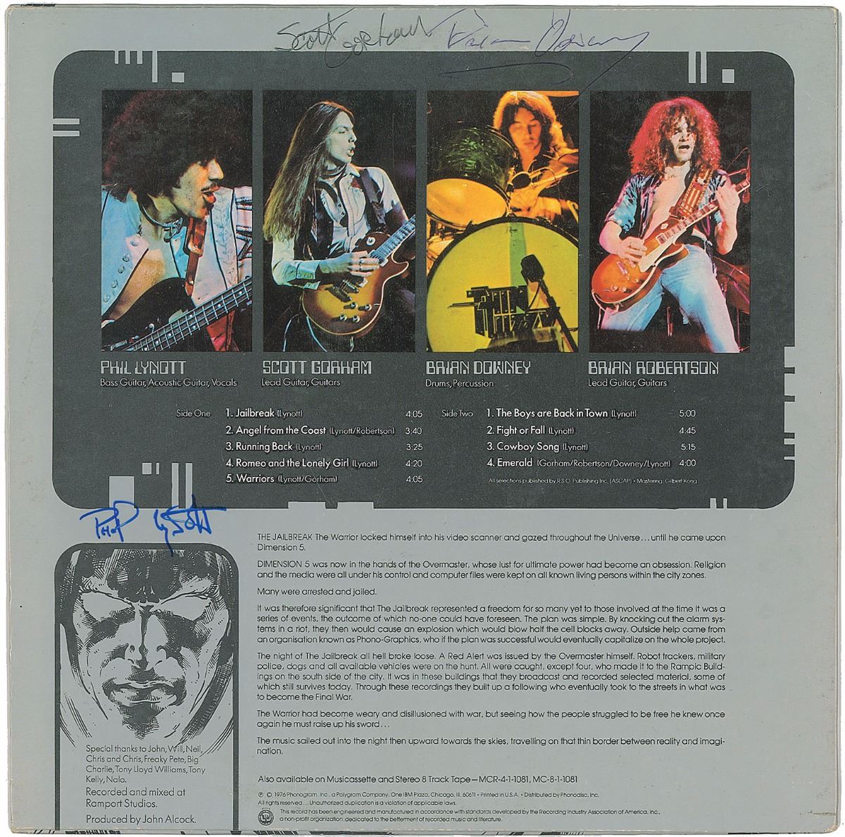 Jailbreak album signed on the reverse in blue felt tip by Phil Lynott and in ballpoint by Scott Gorham and Brian Downey. In fine condition, with trivial edgewear. The record is included.