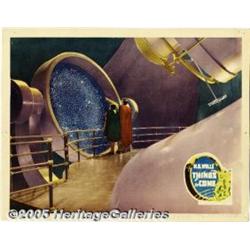 <B>Things to Come (United Artists, 1936).</B></I> Lobby Card (11" X 14"). Based on H.G. Wells prognosticative 1933 essay "The Shape of Things to Come" this film encompasses a frame of time that spans ninety-four years, from 1940 through 2036. The setting is the London-like metropolis of Everytown, which becomes involved in a second world war that last three decades. After the war an organization called "Wings Over the World" brings about stunning technological advances and a new civilization emerges from the ashes. But there is a movement, lead by the sculptor Theotocopulos, that opposes progress, believing humanity has been sacrificed for the sake of technology. "Things to Come" was filmed on an epic scale with eye-popping special-effects such as the ones featured on this visually stunning scene card. There are pinholes around the borders, one light smudge mark and a small amount of surface paper loss to the bottom right corner. The colors are bold and vibrant and the card displays very well. From the collection of Johnny Ramone. Fine/Very Fine.