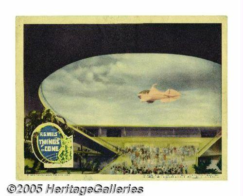 <B>Things to Come (United Artists, 1936).</B></I> Lobby Cards (2) (11" X 14"). H.G. Wells' prognosticative 1933 essay "The Shape of Things to Come" was filmed on an epic scale with eye-popping special effects, such as the ones featured on these visually stunning scene cards. There are pinholes in the corners and borders, surface wrinkles, some smudge marks and a few small edge tears. Also, there's a few small scuffs and one small corner chip. Together these cards would grade Fine+.
