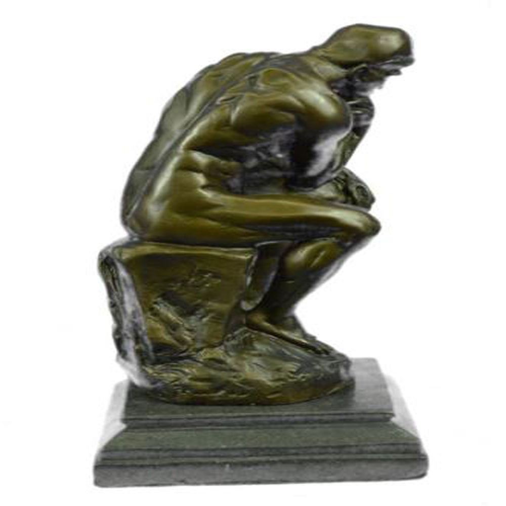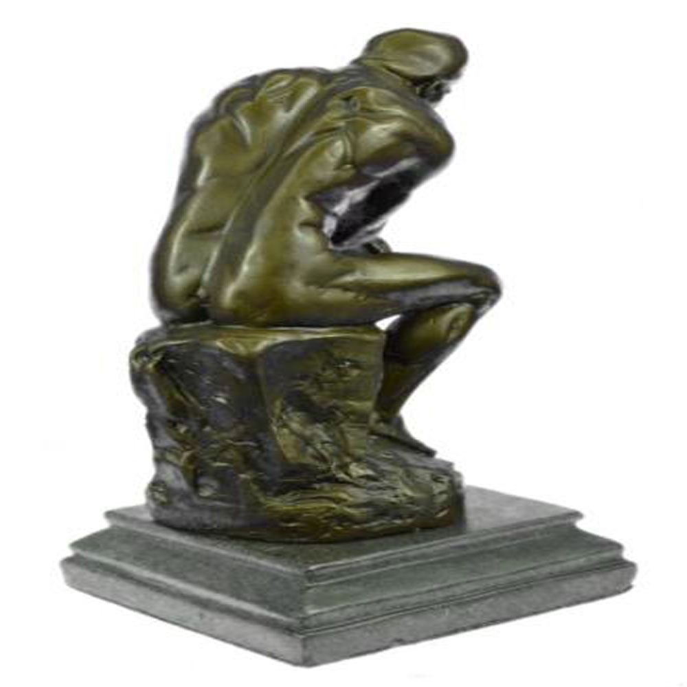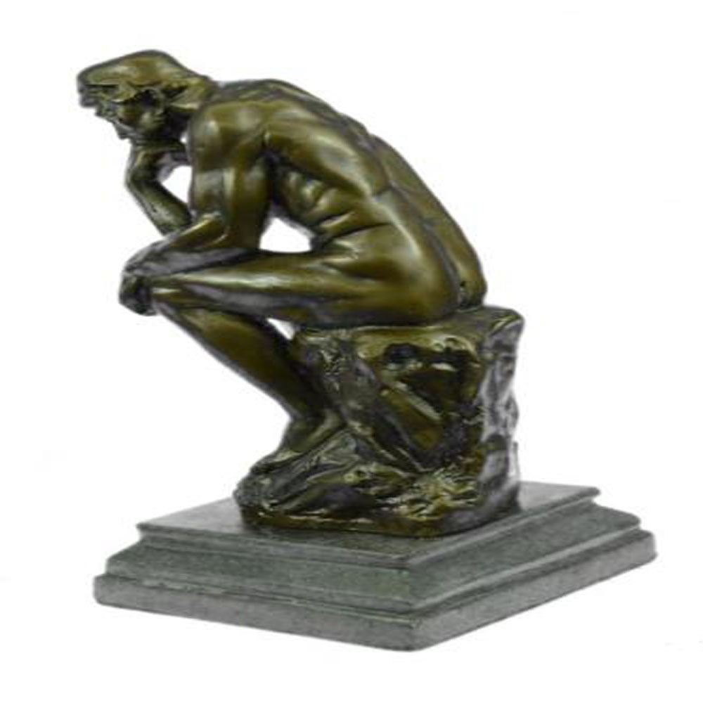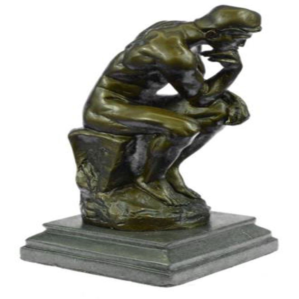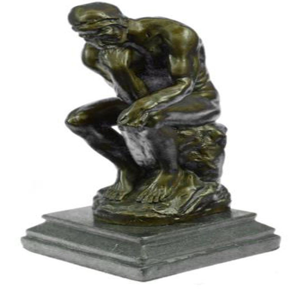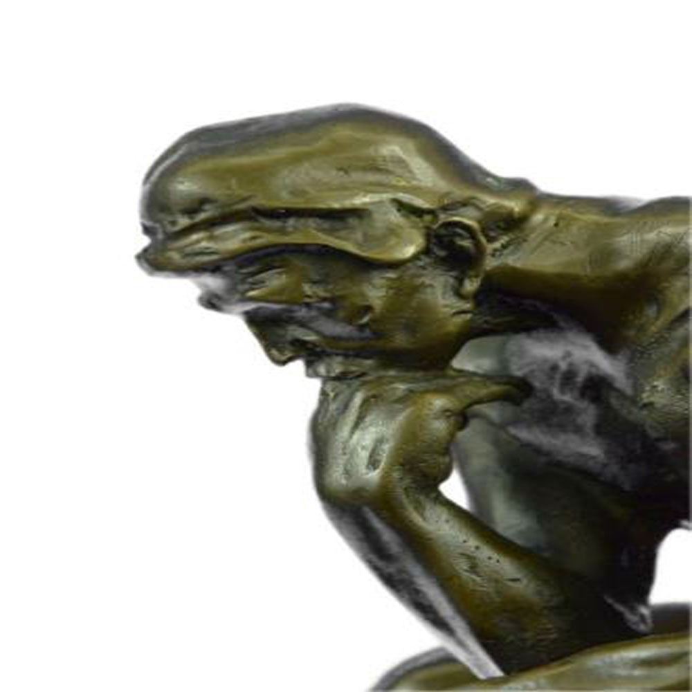 This is a bronze rendition of The Thinker which originally was a bronze and marble sculpture by Auguste Rodin. He first cast, of 1902, is now in Paris, there are some twenty other original castings as well as various other versions, studies, and posthumous castings. It depicts a man in sober meditation battling with a powerful internal struggle. The sculpture was captured using the archaic method of lost wax casting and stained with a brown patina finish for preservation and it is mounted upon a marble base. Bronze Dimensions with Marble Base: Height 11 X Width 5 inches. Weight: 10 LBS.