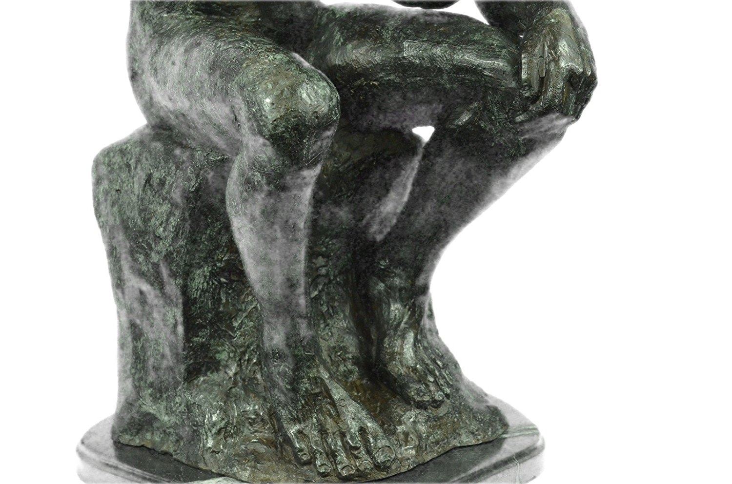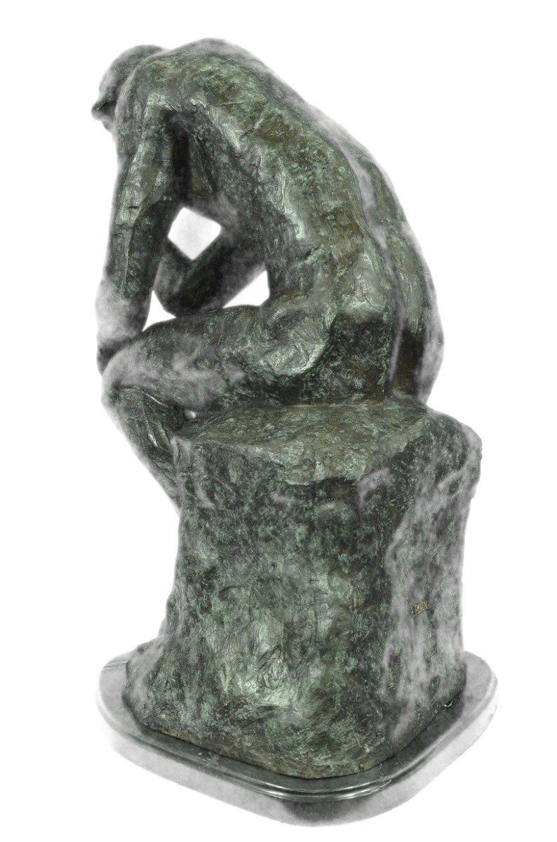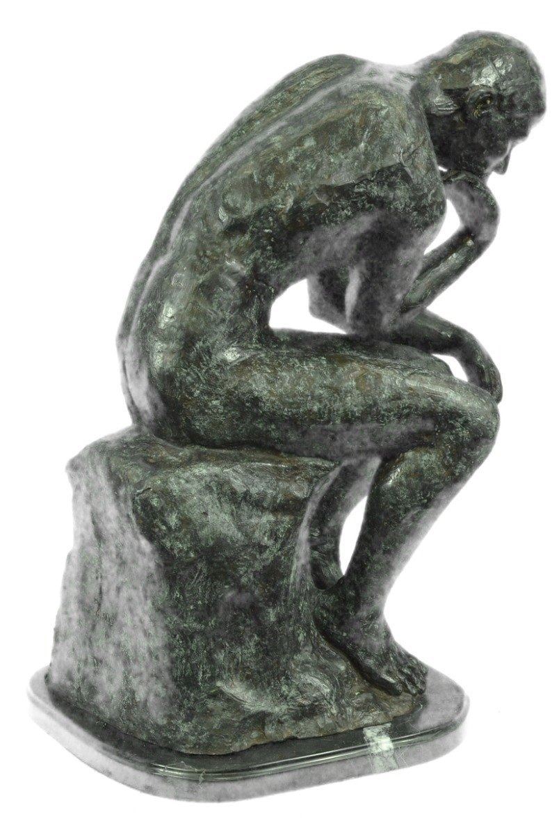 This is a bronze rendition of The Thinker which originally was a bronze and marble sculpture by Auguste Rodin, whose first cast, of 1902. It depicts a man in sober meditation battling with a powerful internal struggle. It is often used to represent philosophy. The sculpture was captured using the archaic method of lost-wax casting and stained with a Green patina finish for preservation. It is mounted upon a black marble base. Bronze Dimensions with Marble Base: Height 24 X Width 14 inches. Weight: 45 LBS. Inventory: 28-5587822582