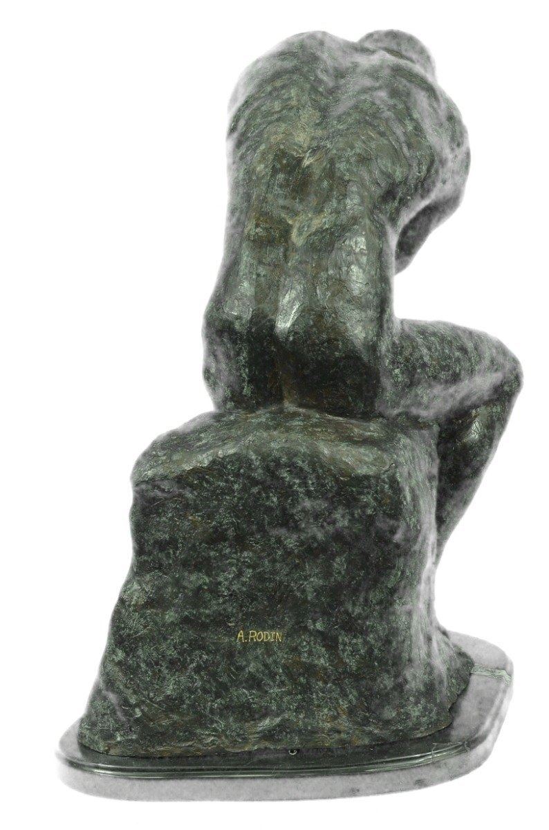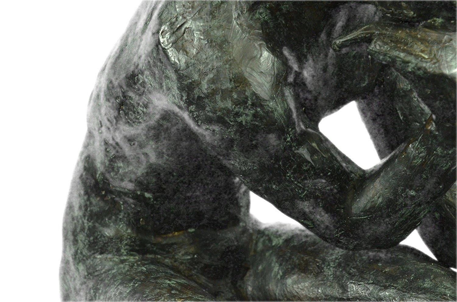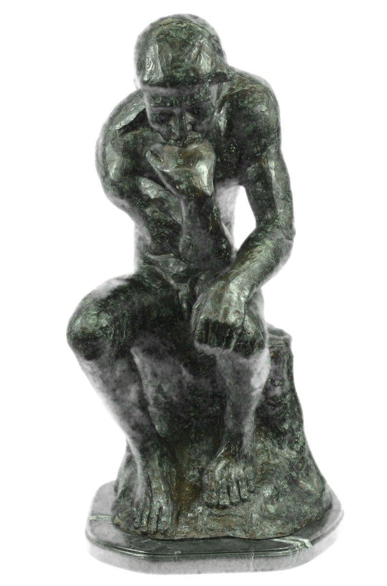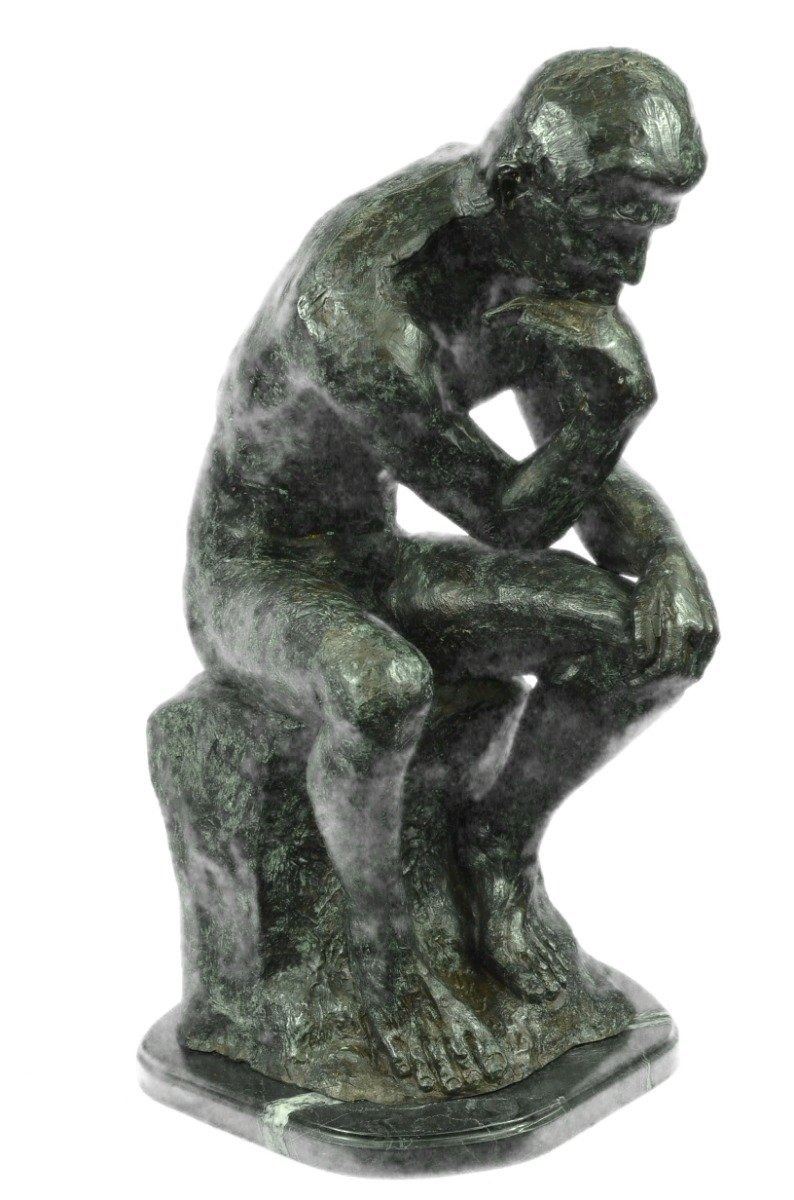 This is a bronze rendition of The Thinker which originally was a bronze and marble sculpture by Auguste Rodin, whose first cast, of 1902. It depicts a man in sober meditation battling with a powerful internal struggle. It is often used to represent philosophy. The sculpture was captured using the archaic method of lost-wax casting and stained with a Green patina finish for preservation. It is mounted upon a black marble base. Bronze Dimensions with Marble Base: Height 24 X Width 14 inches. Weight: 45 LBS. Inventory: 28-5587822582