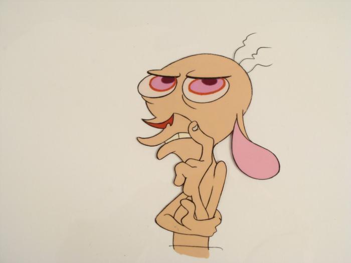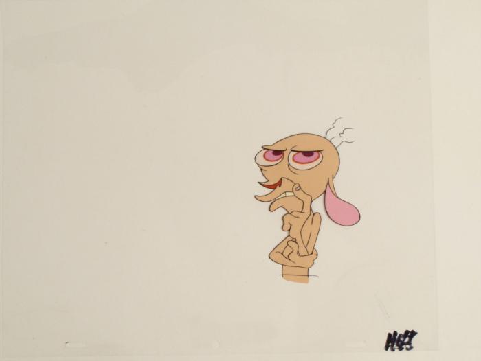 This is an original production animation cel from the Nickelodeon TV show Ren & Stimpy. The show follows two characters - Ren, a crazy Chihuahua - and - Stimpy, an incredibly stupid cat - as they think up to all kinds of hair brained schemes and get themselves into some sticky situations. The Ren and Stimpy Show debuted in August 1991 with a two-part episode, 'Stimpy's Big Day / The Big Shot' and became an instant hit. It was the third Nicktoon ever to be aired on the Network alongside Doug and Rugrats. Ren is thinking hardOriginal Production Art Cel Overall Size of the Cel: 10 1/2" x 1/2" Very Good condition This is an original hand-painted cel set-up used in the production of an episode of "The Ren & Stimpy Show." Each one-of-a-kind set-up represents a slight change in position of the characters. When individually photographed and projected in rapid succession, the images appear to move.