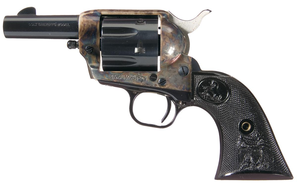 Standard short two line address on top of the barrel, "COLT SHERIFF'S MODEL" on the left side and "COLT SAA .44-.40" on the right side. Two line, three patent dates on the left side of the frame followed by the Rampant Colt. Back and front straps under the grip is marked with the matching serial number casehardened frame, blue remaining parts and fitted with two piece Rampant Colt / American eagle grips numbered to the gun.
