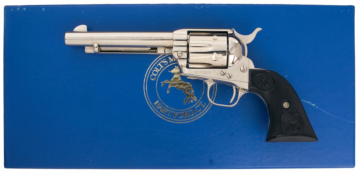 Features standard one line barrel address on top with the left side marked "COLT SINGLE ACTION ARMY .44-40", the left side of the frame is marked with the two line, three date patent information followed by the "Rampant Colt". The matching serial number is marked under the grips on the left side of the front and backstraps. Fitted with checkered plastic "Federal Eagle/Rampant Colt" grips. Complete with Colt blue box.