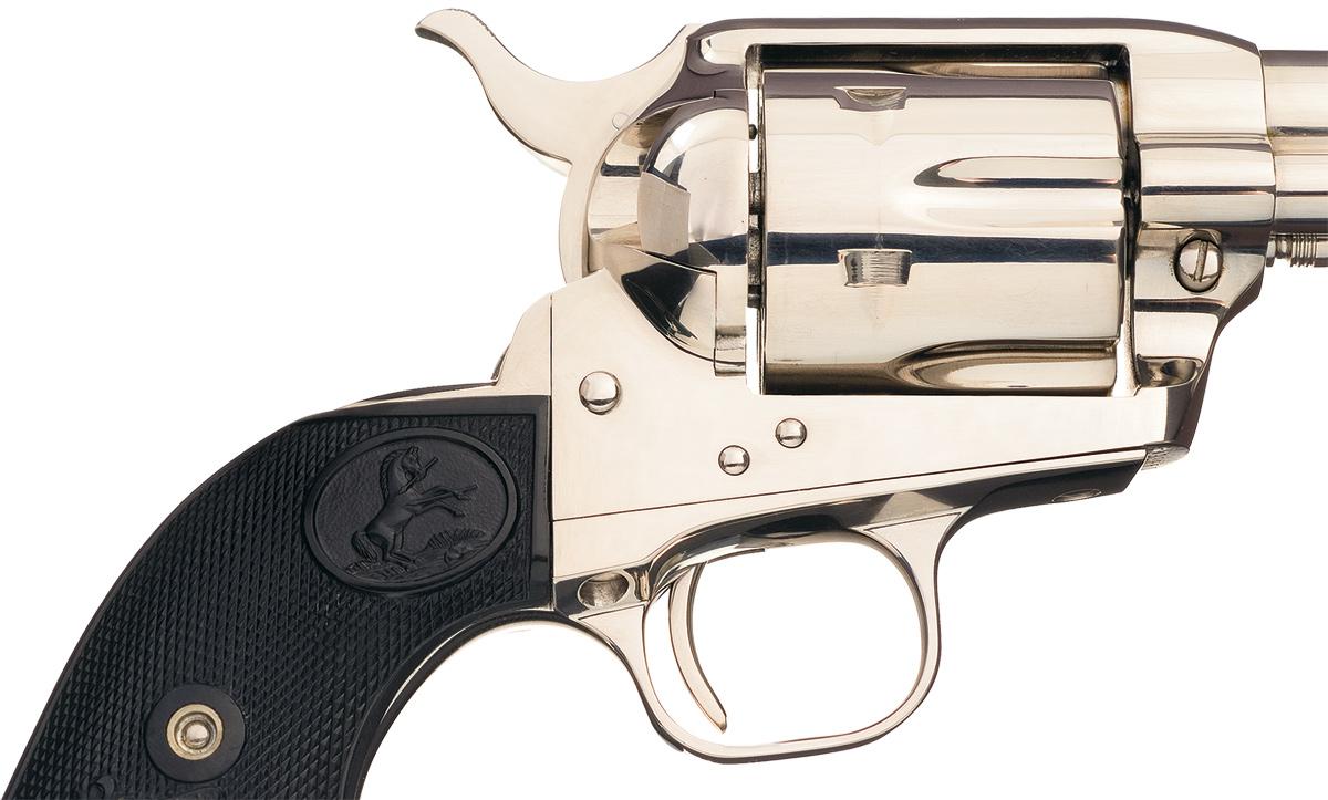 Condition: Excellent, with 99% plus original nickel finish remaining with a light cylinder drag line and some minor scratches. The grips are excellent with the exception of a minor ding on the right panel heel. The box is very fine.