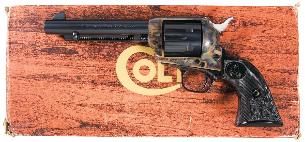 Features standard one line barrel address on top with the left side marked "COLT SINGLE ACTION ARMY .44 SPECIAL", the left side of the frame is marked with the two line, three date patent information followed by the "Rampant Colt". Fitted with checkered plastic "Federal Eagle/Rampant Colt" grips. Serial number on the front and back straps under the grips is mis-matched (SA26738), and the grips match the grip frame numbers. Complete with Colt "wood grain" box numbered to the gun, hanging tag and papers.
