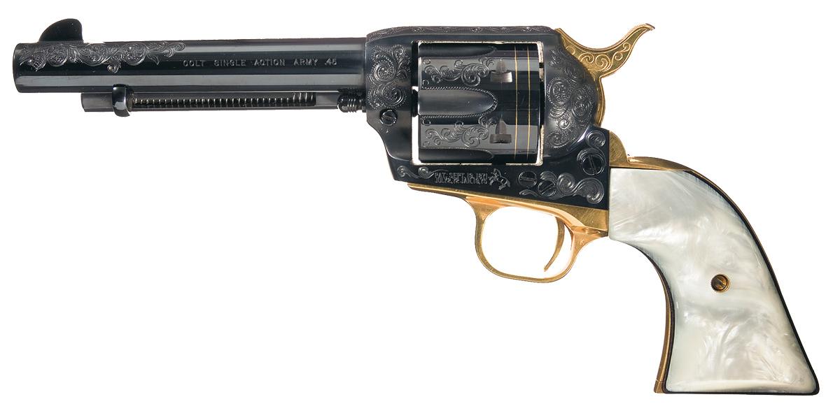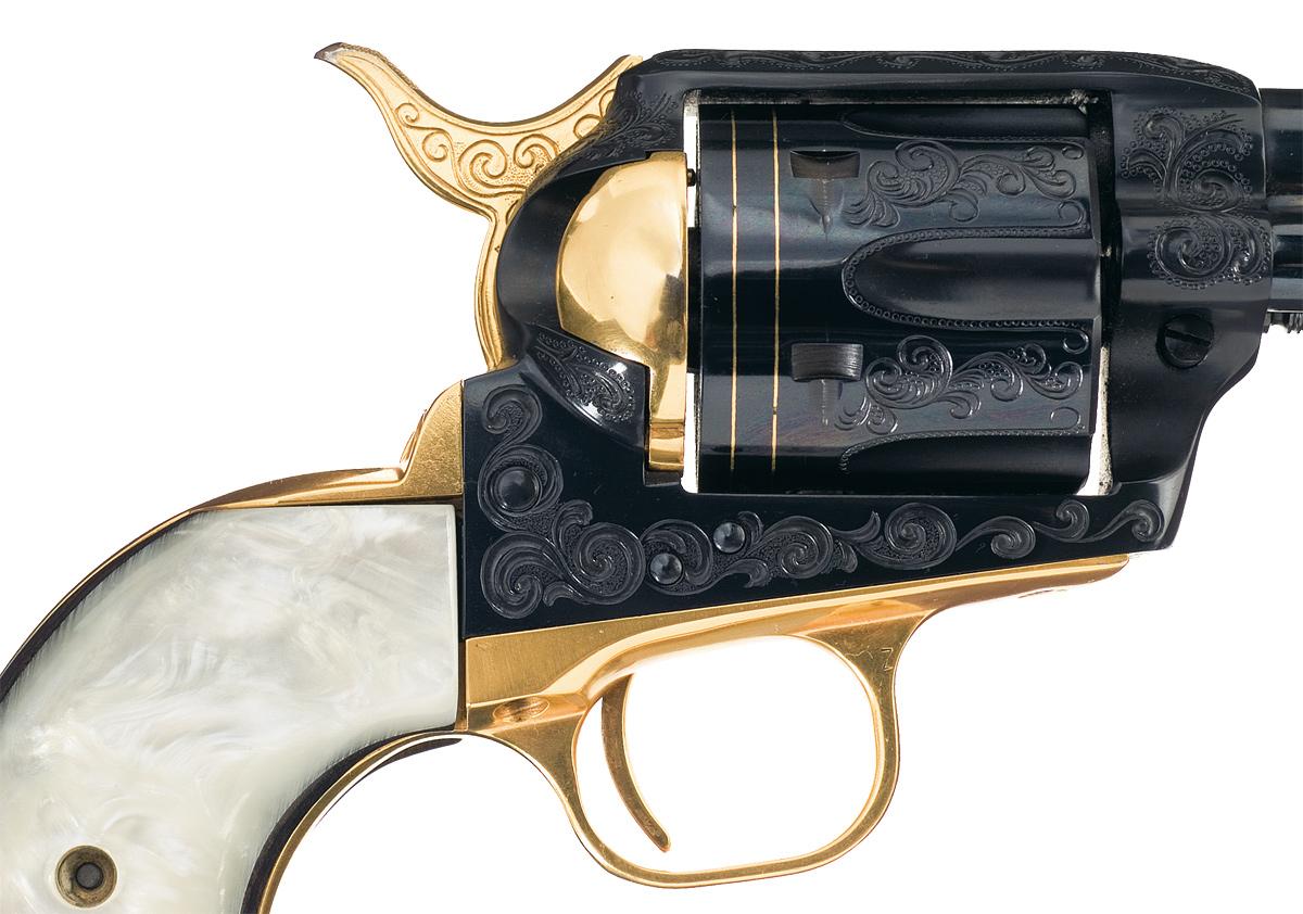 Condition: Very good as custom embellished, with 98% of the current blue and gold finishes, showing light handling marks and a small amount of spotting overall. Grips are very good replacements, with minimal wear and fine grain pattern. Mechanically excellent.
