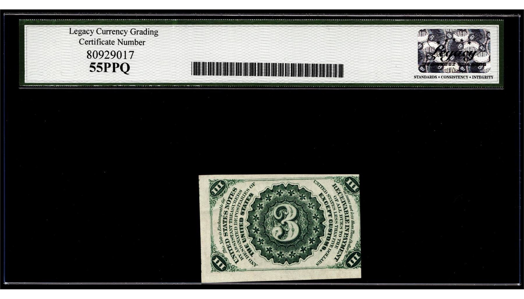 One Third Issue 3 Cents Fractional Currency Note Fr.1226 Legacy Choice About New 55PPQ. Legacy Graded.