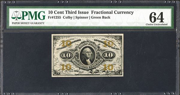 Colby | Spinner signatures, 10 cents, Washington at center, bronze 10's in each corner, PMG graded Choice Uncirculated 64, scarce in high grade.