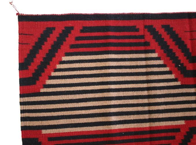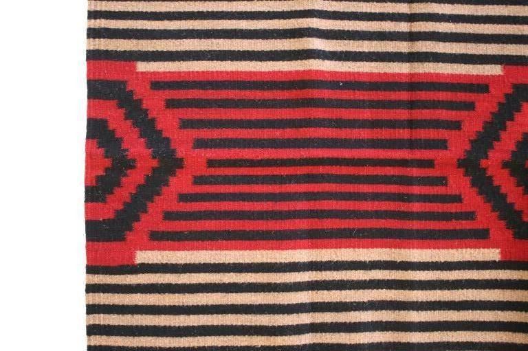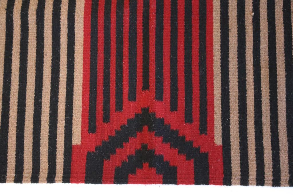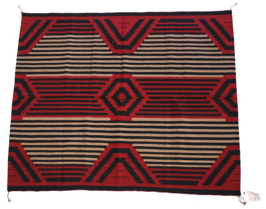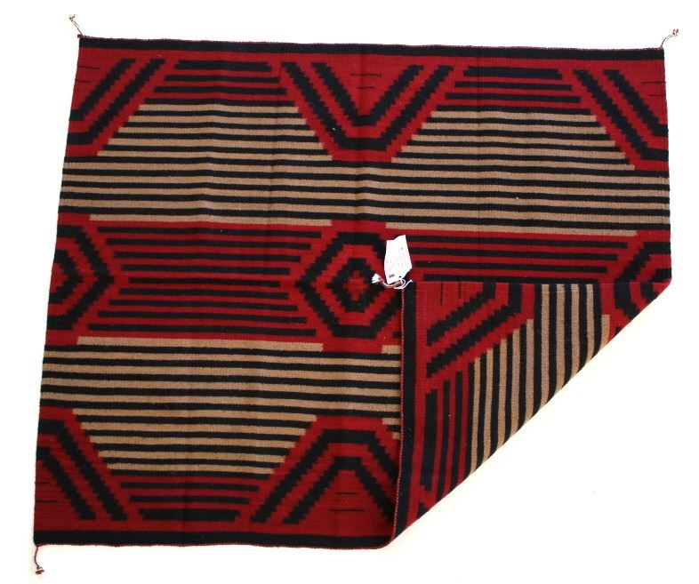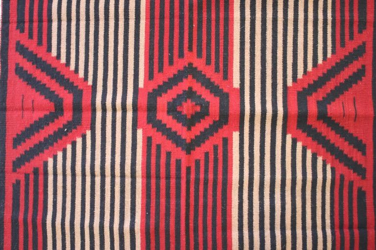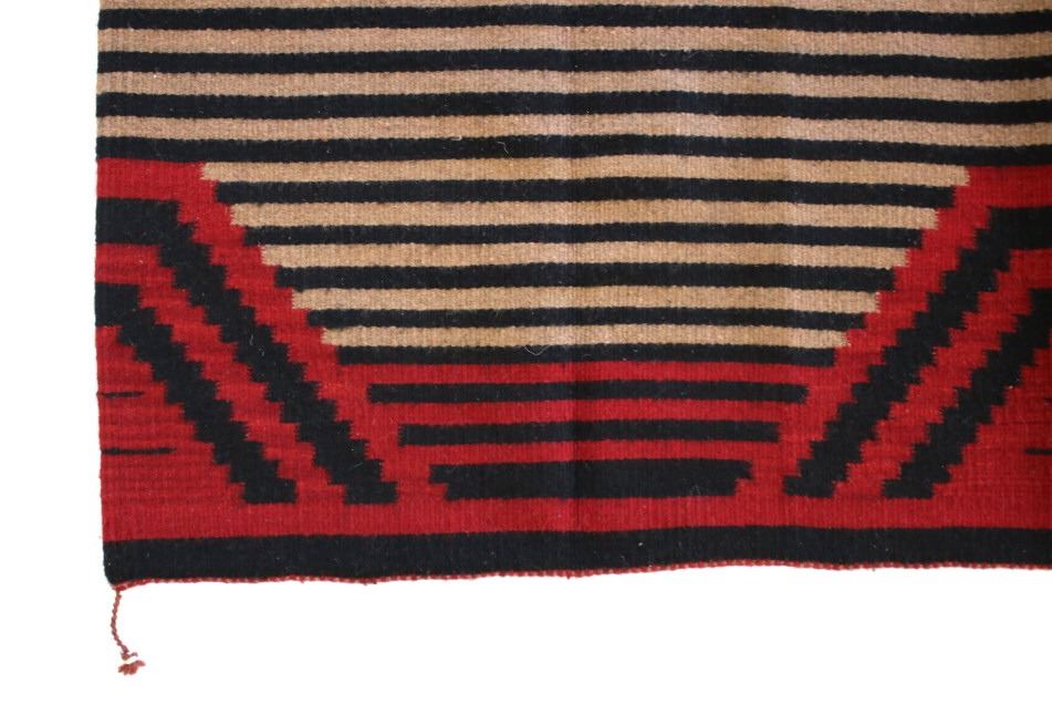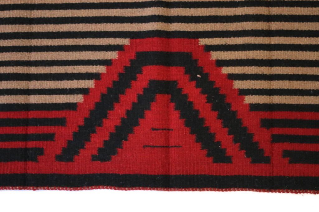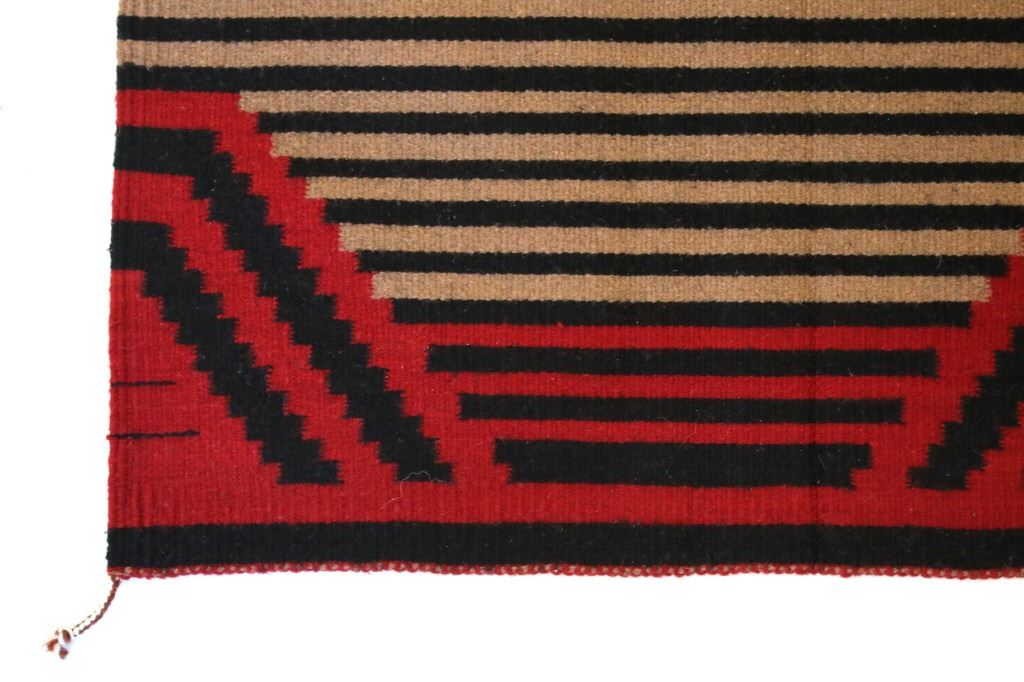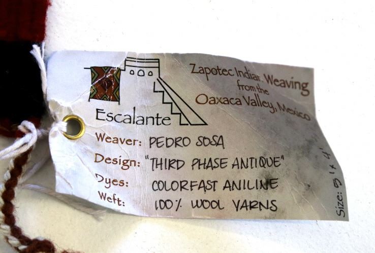 This is an excellent handwoven flat weave rug by master weaver Pedro Sosa using 100% soft fine handspun yarns in an outstanding Third Phase Antique Chief’s Blanket pattern. The rug was handwoven with a tight weave using 100% handspun wool yarns that offers natural variegation and durability with color fast aniline dyes. Tight handwoven weave showing bright rich colors in the fine Third Phase Antique Chief’s Blanket (3rd Phase) pattern in the time-honored Zapotec multi-generational craft by a master weaver, Pedro Sosa. This incredible example shows Sosa’s traditional interpretation of the 3rd Phase blanket with rich red coloring with stepped diamond at the center and replicated at each corner having a linear typical pattern in black and tan / light brown. The piece is brand new in pristine condition with fine tight weave. The rug measures 5’ by 4’ (five foot by four foot).