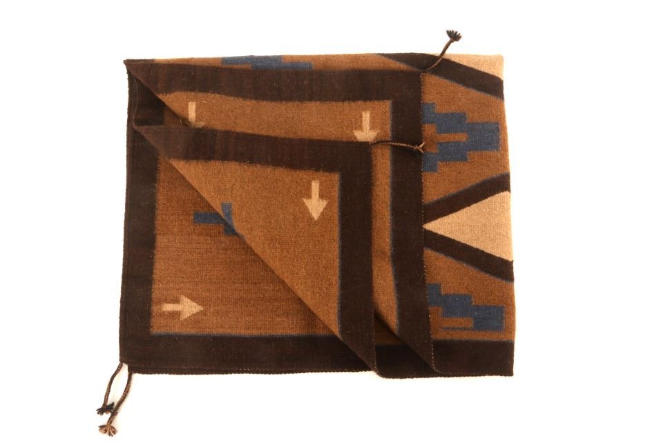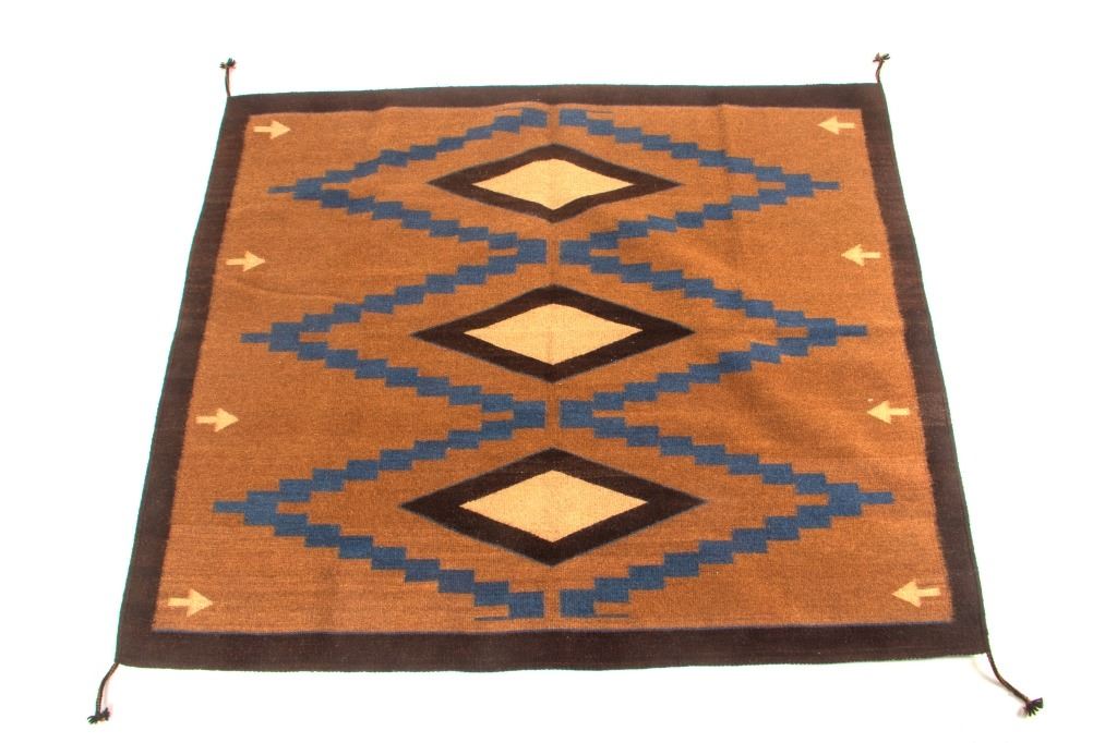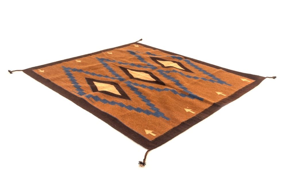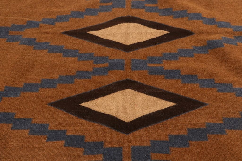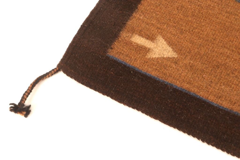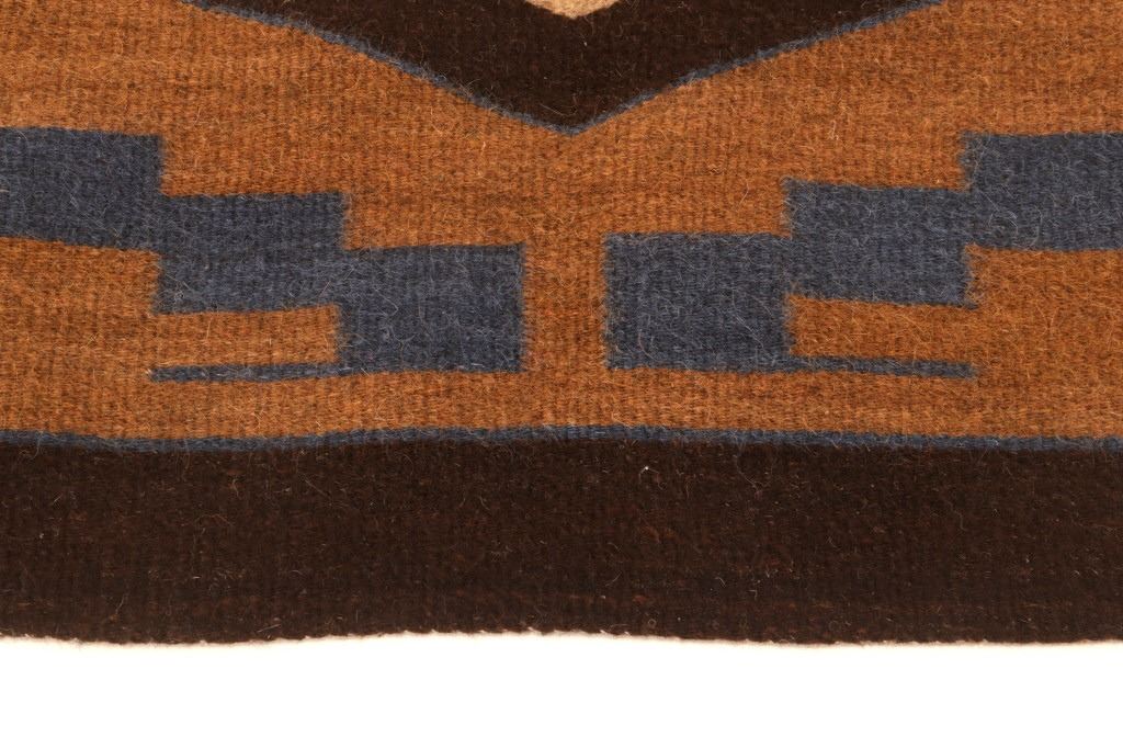 This is an excellent, hand woven flat weave rug by master weaver Pedro Gutierrez. The rug was made using 100% soft, fine, hand spun yarns in a beautiful Third Phase Chief's Relampago pattern. The rug was hand woven with a tight weave using 100% hand spun wool yarns that offer natural variegation and durability with color fast aniline dyes. The rug shows a phenomenal Third Phase Chief's Relampago pattern in the time-honored Zapotec, multi-generational craft by a master weaver, Pedro Gutierrez. This incredible example shows Pedro's traditional interpretation of the Third Phase Chief's Relampago blanket, with rich banded diamonds symmetrically throughout the rug, diamond decorations in an earth brown field, accentuating blue and dark brown diamonds, and cream arrow dynamics set before the border of the rug shown in dark brown. The rug shows a quadruple braided, light brown and black wool tassel construction. The piece is brand new, in pristine condition, with a fine, tight weave. The rug measures 5’ by 4’ (5 foot by 4 foot).