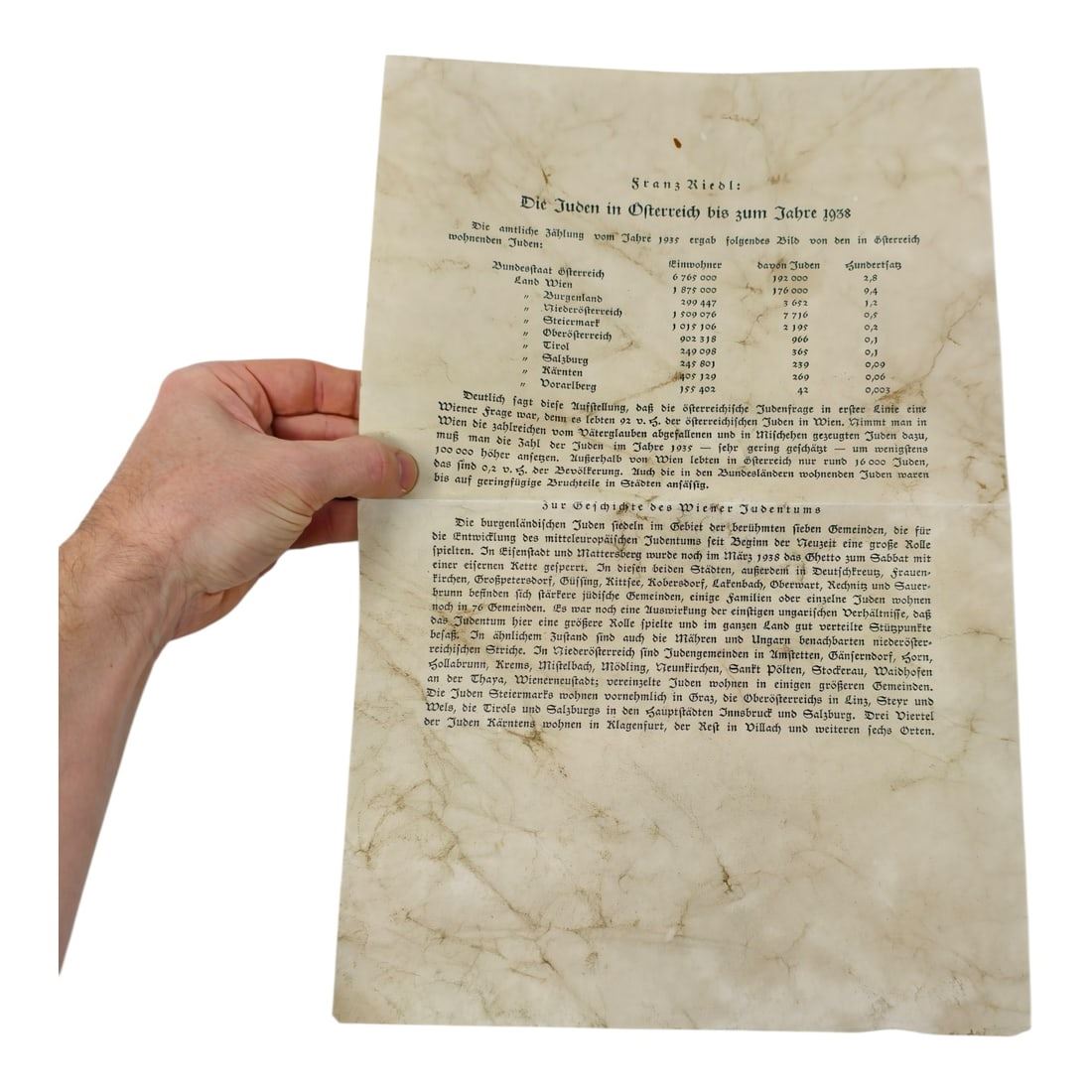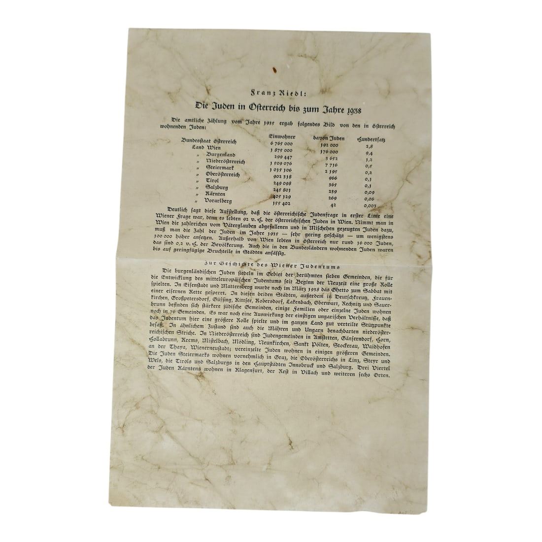This piece is a racial-statistical propaganda sheet likely distributed in Austria after the 1938 Anschluss, to rationalize the persecution and expulsion of Austrian Jews.