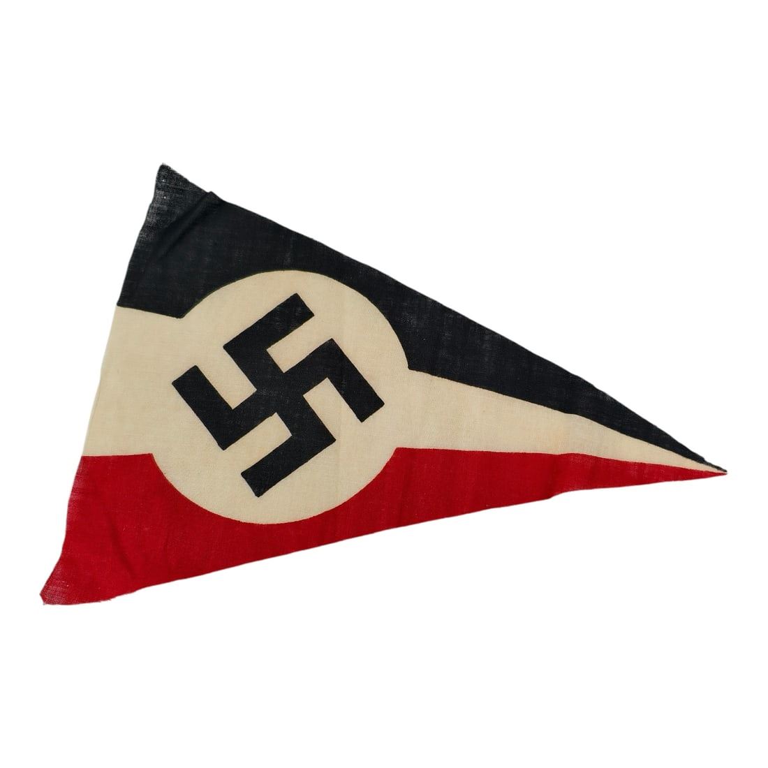 Early Nazi-era pennant — a vehicle or small parade flag featuring the swastika within a white disk on a red and black field.