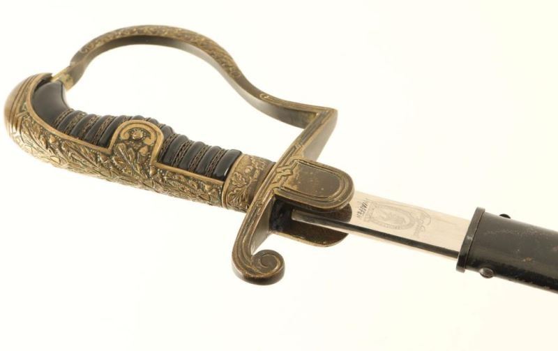Officers sword, Dove head hilt, maker ernist pack sohn marked, 34" blade, Folded wing eagle and swaiska on cross guard, blade is good condition, leather washer in place. Original scabbard with some flaking to paint.