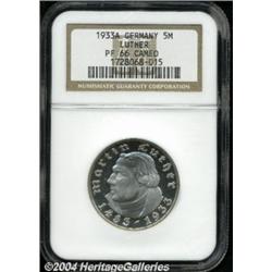 Third Reich. Luther 5 Mark 1933A, KM80, Proof 66 Cameo NGC, another drop-dead, gorgeous coin. Important notice: Heritage usually auctions material at the rate of 200-250 lots per hour. On some occasions eBay Live bid software or the Internet may not be able to keep up with the pace of the auction. We recommend placing a realistic absentee bid now as insurance to avoid disappointment. Occasionally the auctioneer may eliminate or reject an eBay Live bid, and the auctioneer may also reopen a lot after the close of the eBay live bidding (usually because we missed an audience bid), and may reject your bid even if it shows you as the winning bidder. By bidding via eBay Live, you agree that Heritage may award the lot to another bidder at its sole discretion under the circumstances described above or any other reasonable circumstances. Also please note that all Heritage lots purchased through eBay Live carry a 20% Buyer's Premium. Please make sure you read the Terms and Conditions before you bid.