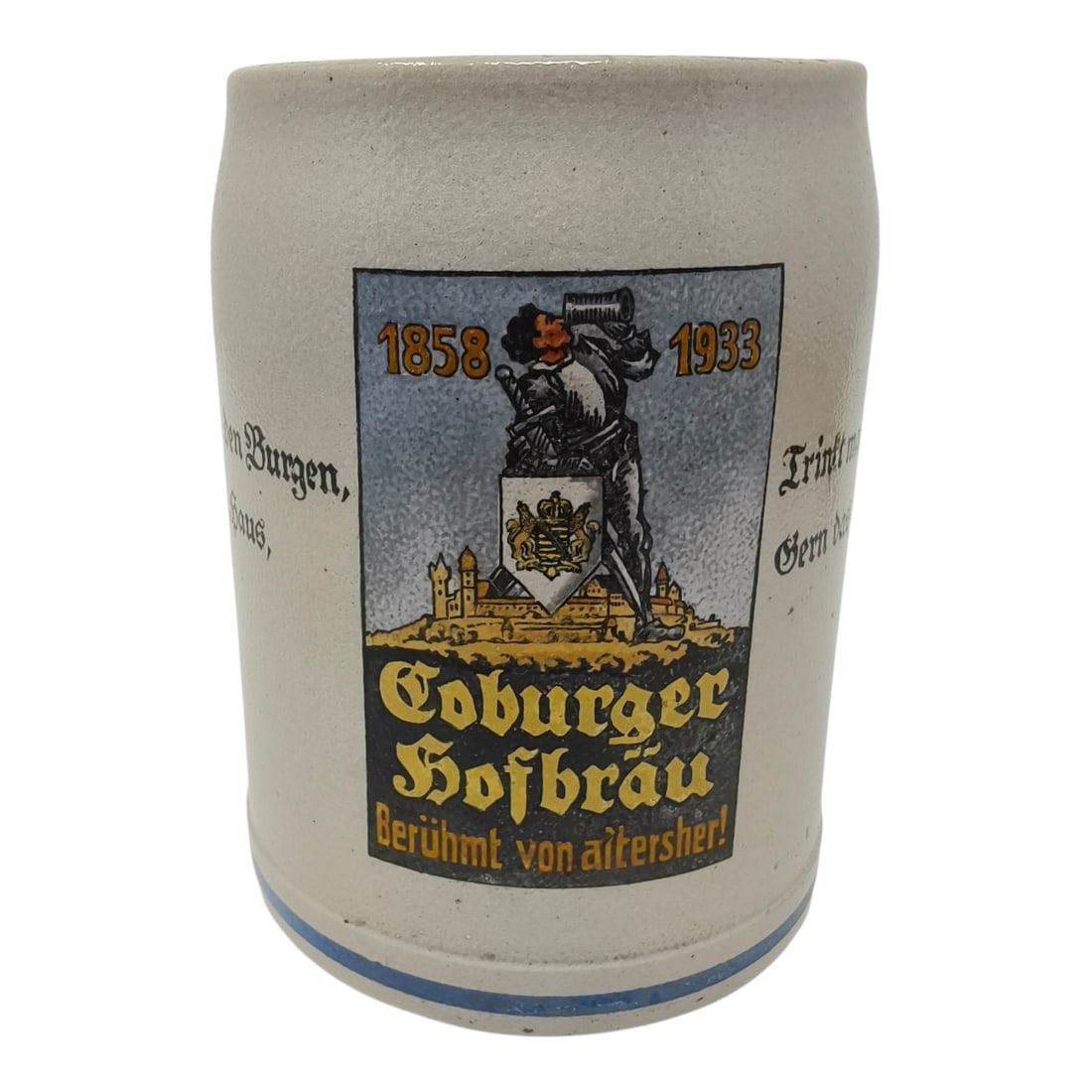 This is a commemorative beer stein from the Coburger Hofbräu brewery — a historic Bavarian brewery based in Coburg, Germany. Likely produced in 1933, marking the 75th anniversary (1858–1933) of the brewery. “Just as back then in the castles,Later in the guilds’ halls,Even in the new Germany,One gladly drinks the beer from the Hofbräuhaus.”