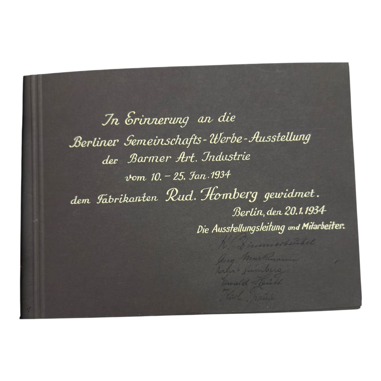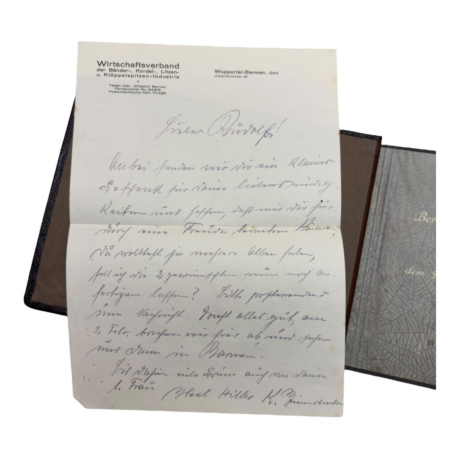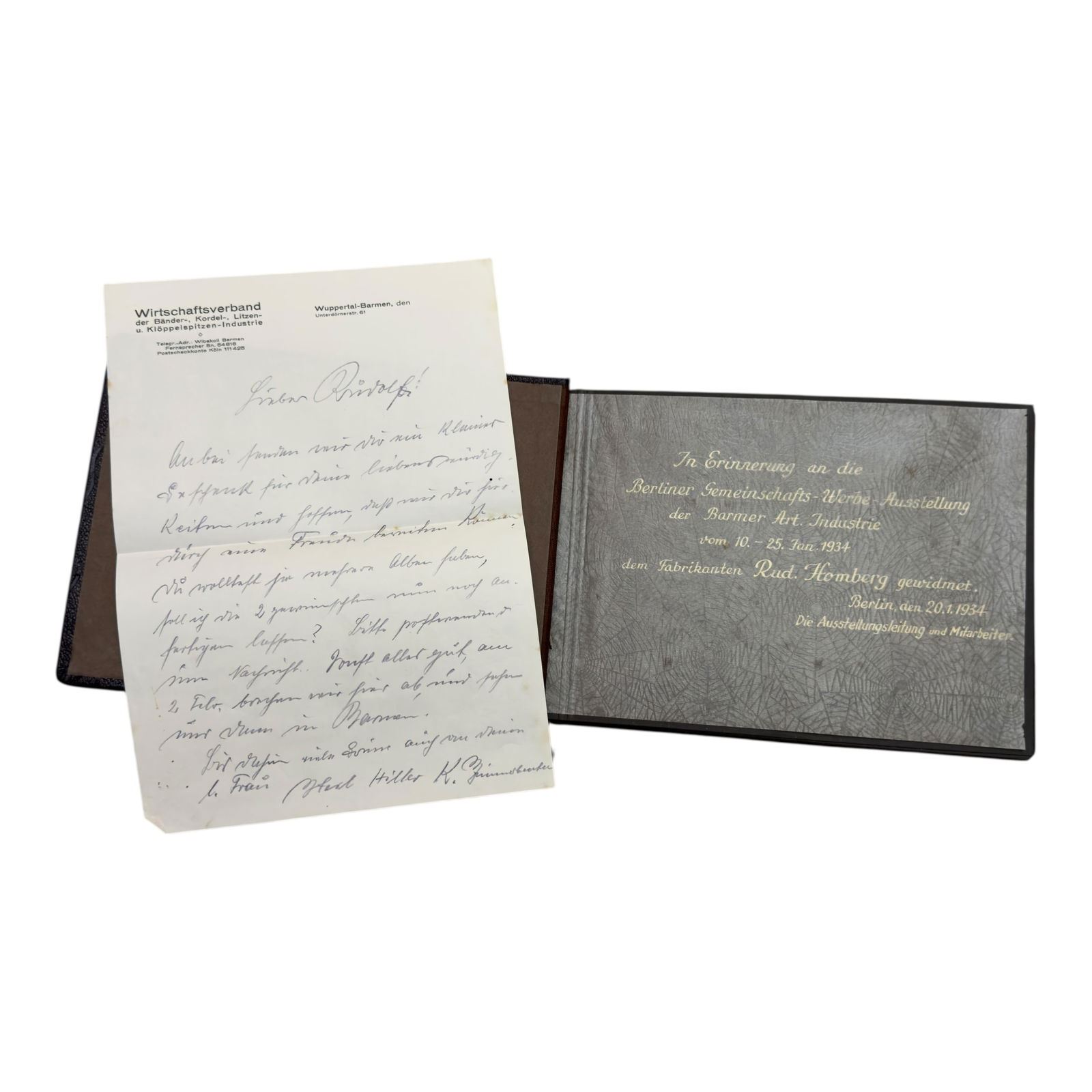 Third Reich Nazi Photo Presentation Album from Shop with personal letter from the shop owner. The handwritten letter on the letterhead of the:Wirtschaftsverband der Bänder, Kordel-, Litzen- u. Klöppelspitzen-Industrie(= Economic Association of the Ribbon, Cord, Braid, and Bobbin Lace Industry) The letter roughly translates to:Dear Rudolph,Along with this, we are sending you a small gift as thanks for your recent lecture. We are counting on and hoping that we can establish a solid, lasting connection through a sponsor.How are you recovering from our old times? Should I send you the 2 [items/photos] made together with me? Please handle them as you see fit.All the best again — 2 photos will soon reach you as news about it in Barmen.In the meantime, greetings also from your [lady/friend].With Hitler greeting