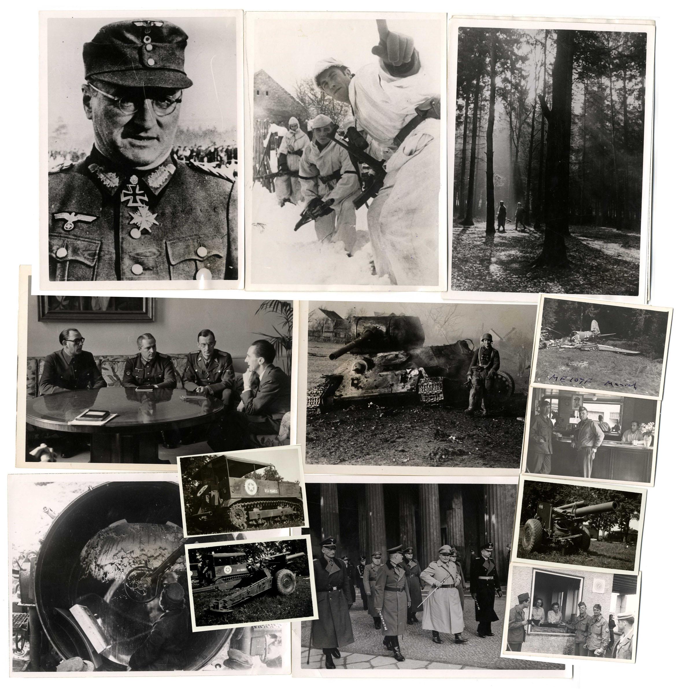 Incredible collection of WWII photographs taken by Hitler's personal photographer, Heinrich Hoffman. Lot includes 38 black and white 5'' x 7'' photos, many of which include German language captions and photographer Heinrich Hoffmann's stamp on verso. Interestingly, Hoffman was responsible for introducing the Chancellor to his future wife, Eva Braun, as she was Hoffman's lab assistant at the time. Notable images include a photo of Air Force commander Hermann Goering; two photos of propaganda minister Joseph Goebbels; a portrait of General Ferdinand Schorner; various war-ravaged urban areas and battlements; WWII-era tanks, planes and artillery; and countless photos of German soldiers ''dug-in'' and ''on patrol.'' Near fine.