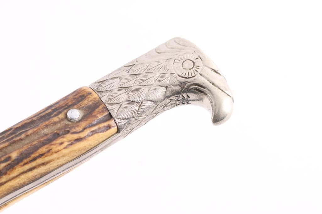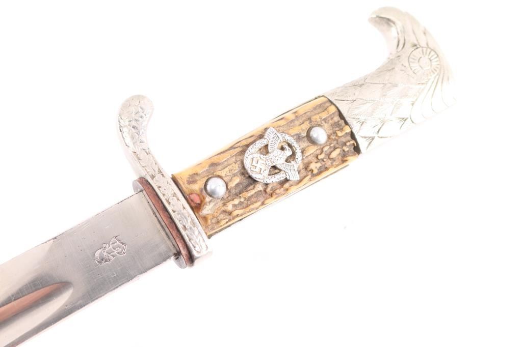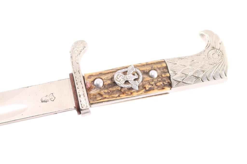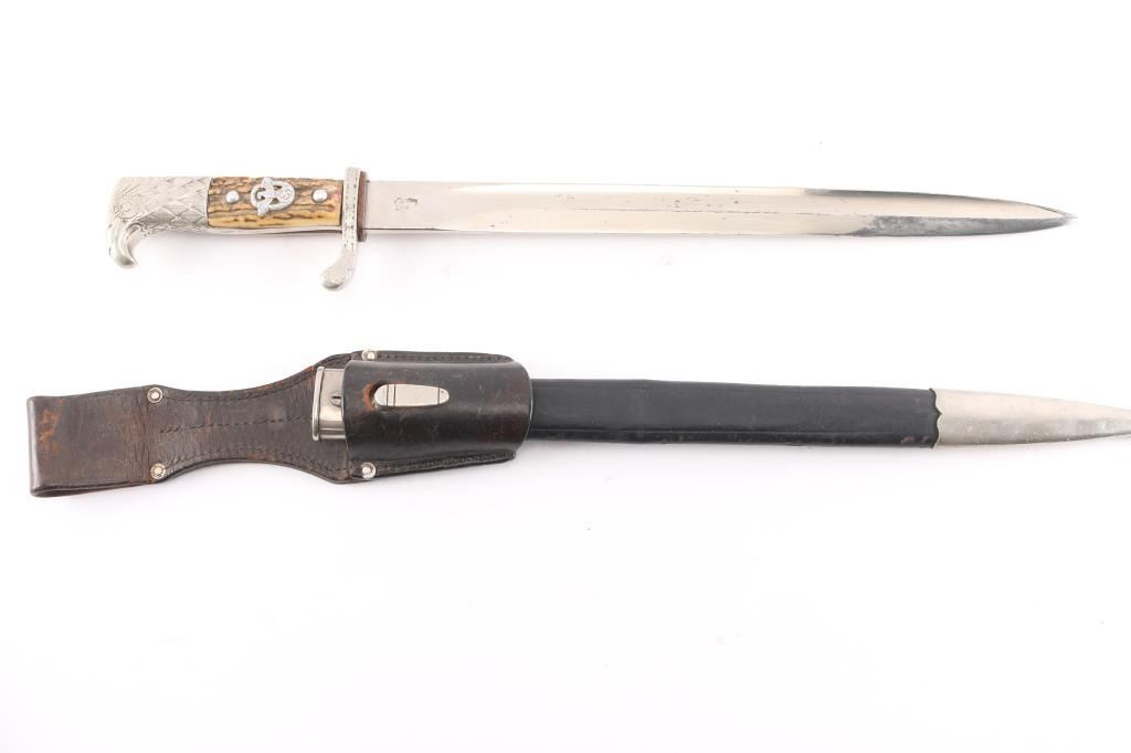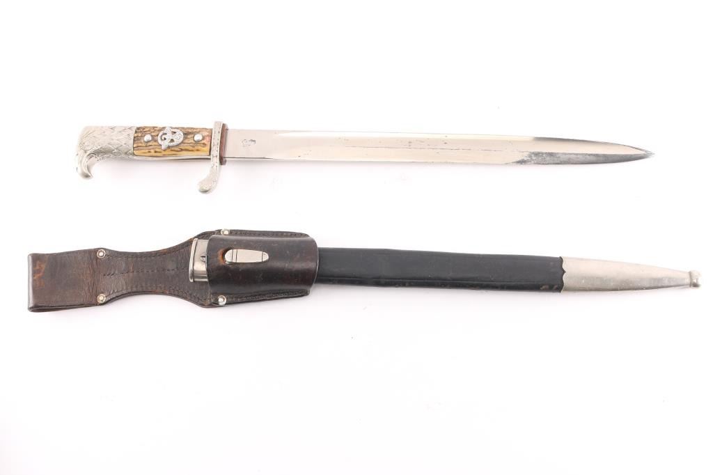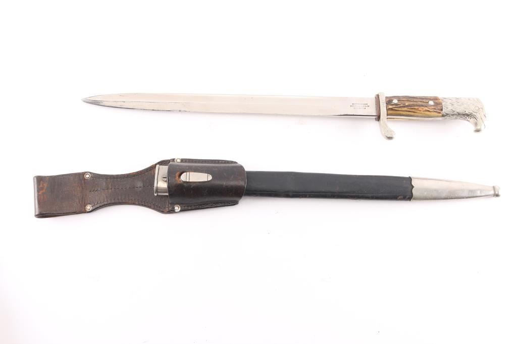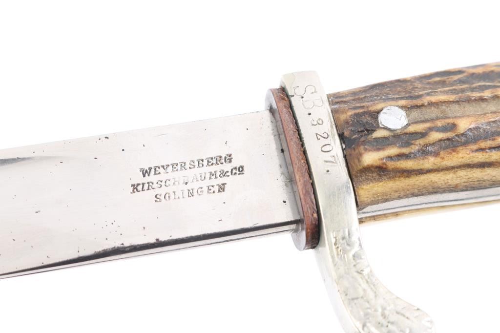 WKC Police Dress Bayonet. The nickel-plated blade, with great shine. There is a an area about 2 1/2" of light pitting on the right side towards the tip. The blade is well marked, with a stamped “knight’s helmet” on the obverse ricasso, and the full maker name “Weyersberg, Kirschbaum & Co, Solingen.” (WKC) on the reverse. The handle is beautiful, with only light patina to the guard and pommel, and no damage. The stag grip plates are intact, with beautiful light and dark brown tones, and light patina. The wreathed eagle and swastika Polizei emblem on the grip is originally attached, and shows only light wear, with good detail. The crossguard is unit marked “S.B. 3207 ,” "Schutzpolizei Berlin'. the scabbard throat is marked "S.O. 74". S.O "Osnabrueck district" This WKC Police Dress Bayonet is complete with its original leather scabbard. The leather is very well preserved, with no damage; nearly all of the original surface is intact, with strong original color. The nickel plated metal fittings on the scabbard show pleasant luster. Leather washer in place, the leather frog is very good.