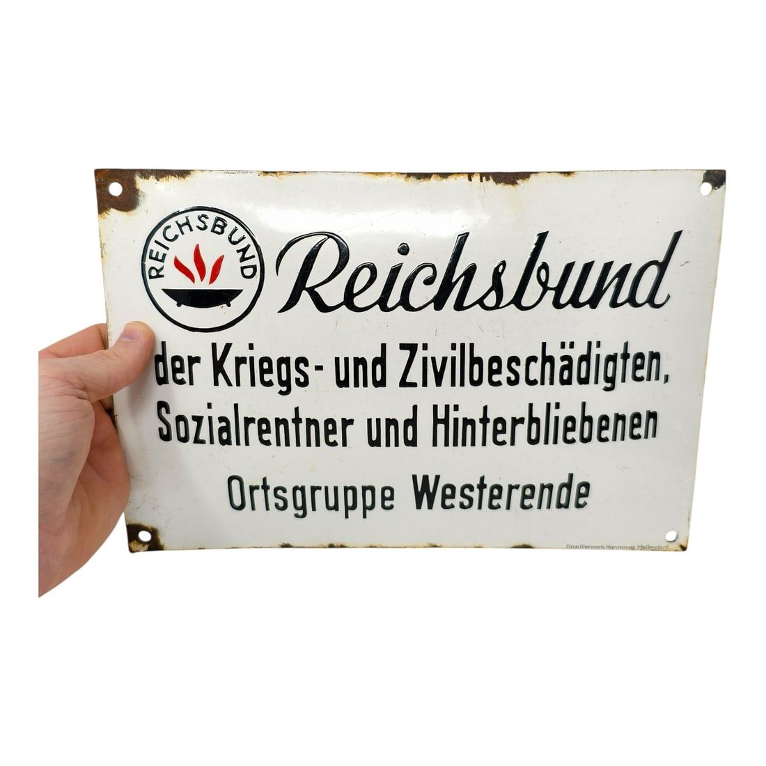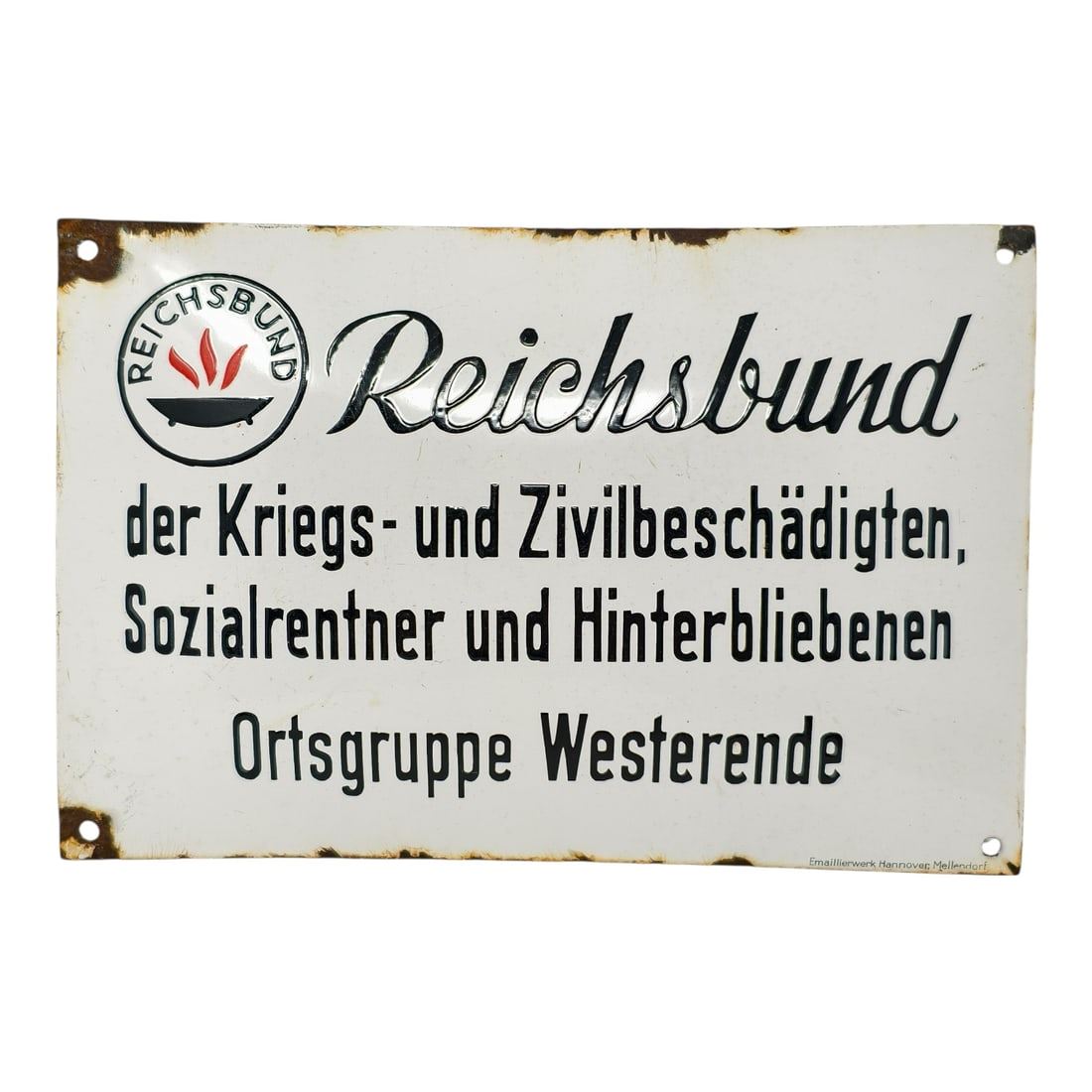 Reichsbund enamel sign (Emailschild) from Germany, representing a local branch of the Reichsbund der Kriegs- und Zivilbeschädigten, Sozialrentner und Hinterbliebenen — the Reich Association of War and Civilian Disabled Persons, Pensioners, and Survivors.