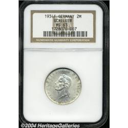 Third Reich. Schiller 2 Mark 1934F, KM84, MS63 NGC, scarcer type. Important notice: Heritage usually auctions material at the rate of 200-250 lots per hour. On some occasions eBay Live bid software or the Internet may not be able to keep up with the pace of the auction. We recommend placing a realistic absentee bid now as insurance to avoid disappointment. Occasionally the auctioneer may eliminate or reject an eBay Live bid, and the auctioneer may also reopen a lot after the close of the eBay live bidding (usually because we missed an audience bid), and may reject your bid even if it shows you as the winning bidder. By bidding via eBay Live, you agree that Heritage may award the lot to another bidder at its sole discretion under the circumstances described above or any other reasonable circumstances. Also please note that all Heritage lots purchased through eBay Live carry a 20% Buyer's Premium. Please make sure you read the Terms and Conditions before you bid.
