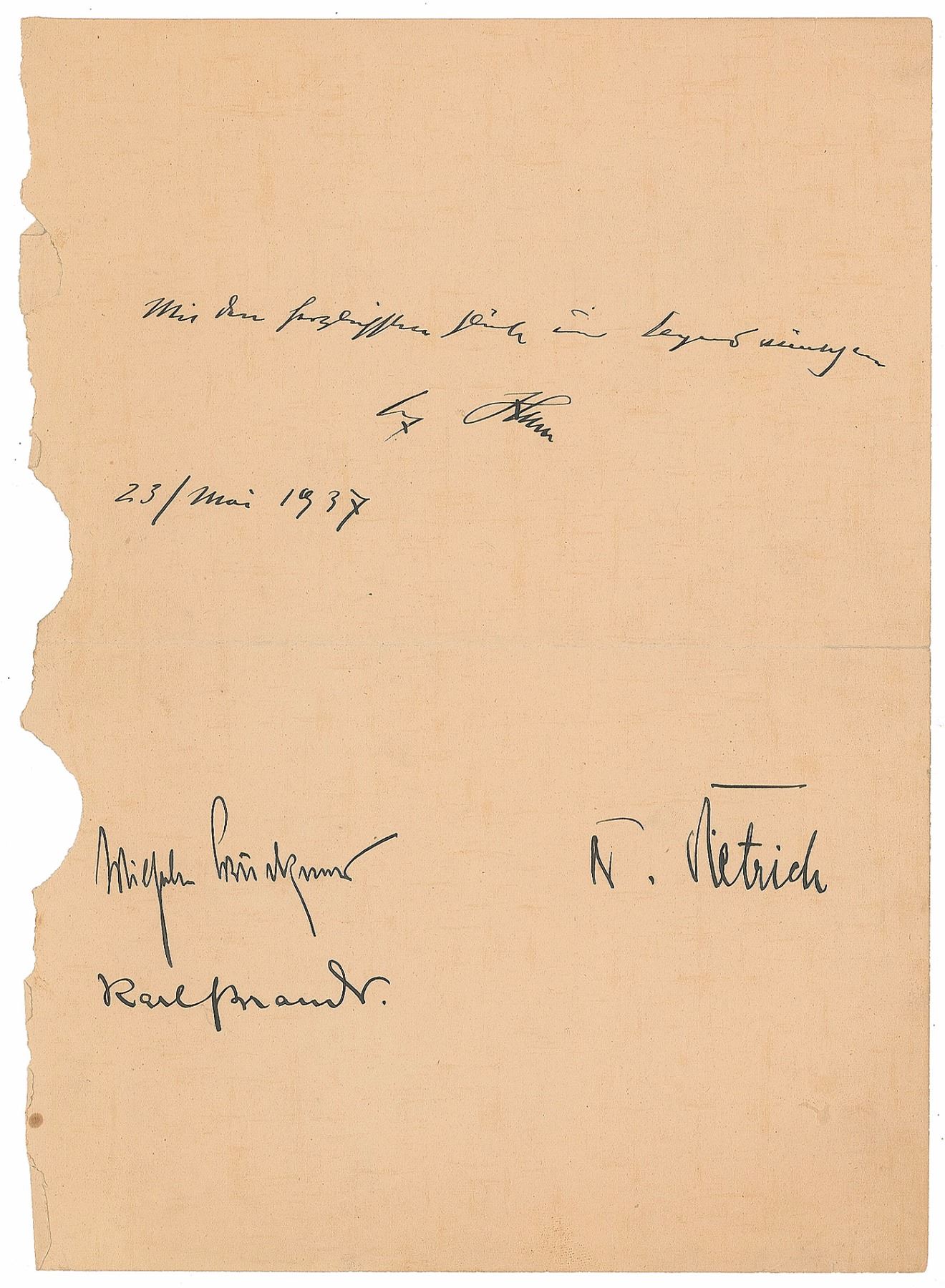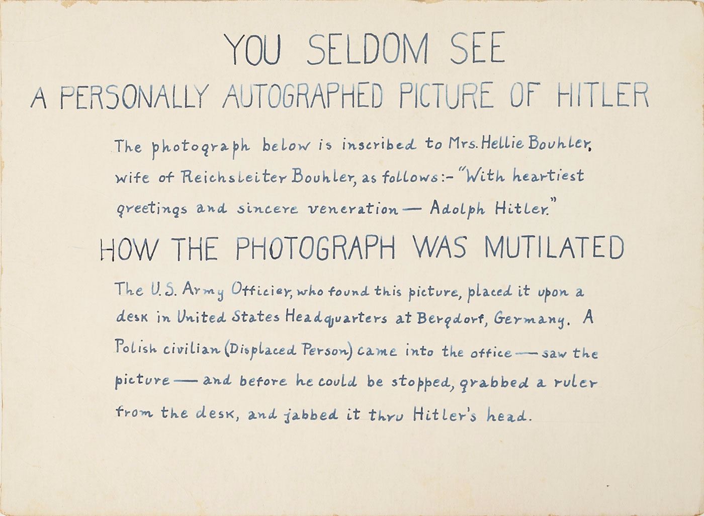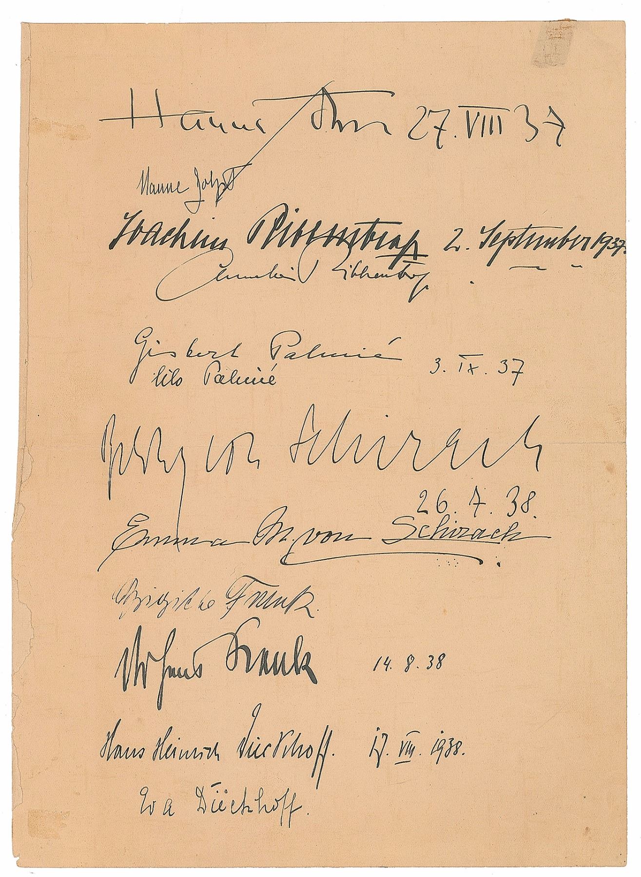 Remarkable group of pages from the guest book of Reichsleiter Philipp Bouhler, taken as a souvenir by a young Philadelphia major while overseas with the Seventh Army and later displayed in a Philadelphia museum. The pages, each measuring 9.25 x 12.75, are signed by an assortment of major Nazi officials and their family members, with dates from 1937 to 1939. One page features a rare inscription and signature by Hitler, (translated), "With hearty greetings and best wishes, Adolf Hitler, 23 May 1939," and is signed below by his aides-de-camp Wilhelm Bruckner, Sepp Dietrich, and Karl Brandt. Signatures on the other pages include: Joachim von Ribbentrop, Annele Ribbentrop, Baldur von Schirach, Emma M. von Schirach, Hans Frank, Brigitte Frank, Hans-Heinrich Dieckhoff, Eva Dieckhoff, Joseph Goebbels, Magda Goebbels, Viktor Lutze, Paule Lutze, Walter Darre, Charlotte Darre, Heinrich Himmler, Marga Himmler, Gudrun Himmler, and Gerhard Himmler. Number strips associated with the museum exhibit are affixed to a few of the sheets, and accompanying descriptive cards are included. In overall very good to fine condition, with small splits along horizontal folds, and edge paper loss to the Hitler sheet not affecting any of the signatures. Accompanied by a newspaper clipping describing the pages of Bouhler's guest book in an article which was syndicated throughout the United States; one of the exhibit cards describes a signed photo of Hitler (no longer present) that was mutilated by a displaced Polish person who came upon it in the American soldier's office. Provenance: Swann Galleries, 1984.